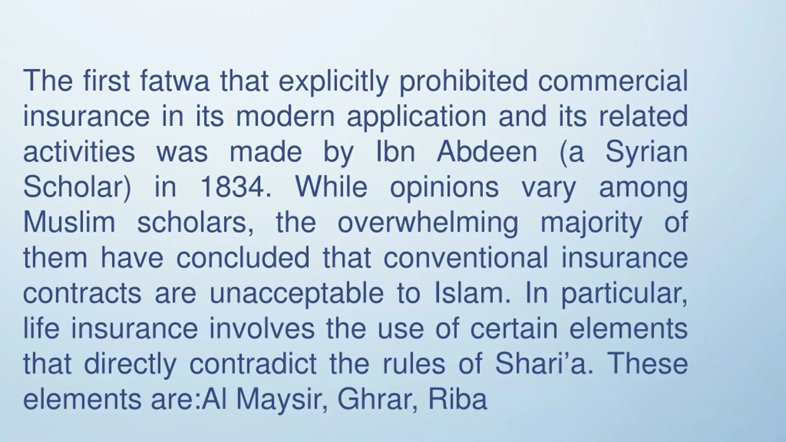 The first fatwa that explicitly prohibited commercial insurance in its modern application and its related activities was made by Ibn Abdeen (a Syrian Scholar) in 1834. While opinions vary among Muslim scholars, the overwhelming majority of them have concluded that conventional insurance contracts are unacceptable to Islam. In particular, life insurance involves the use of certain elements that directly contradict the rules of Shari a. These elements are:Al Maysir, Ghrar, Riba