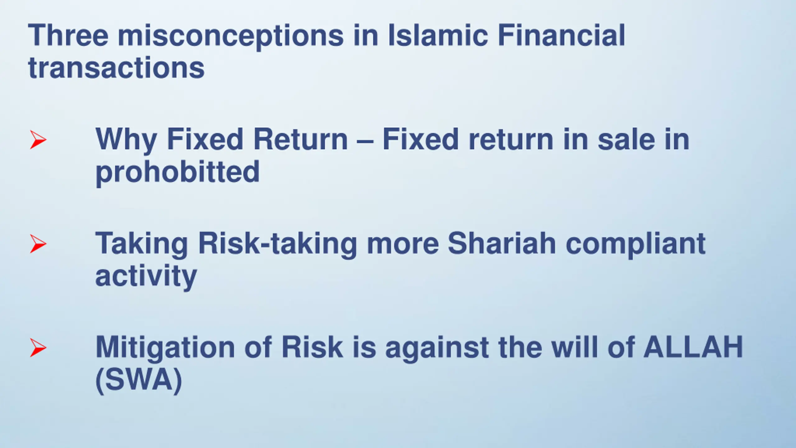 Three misconceptions in Islamic Financial transactions Why Fixed Return Fixed return in sale in prohobitted Taking Risk-taking more Shariah compliant activity Mitigation of Risk is against the will of ALLAH (SWA)