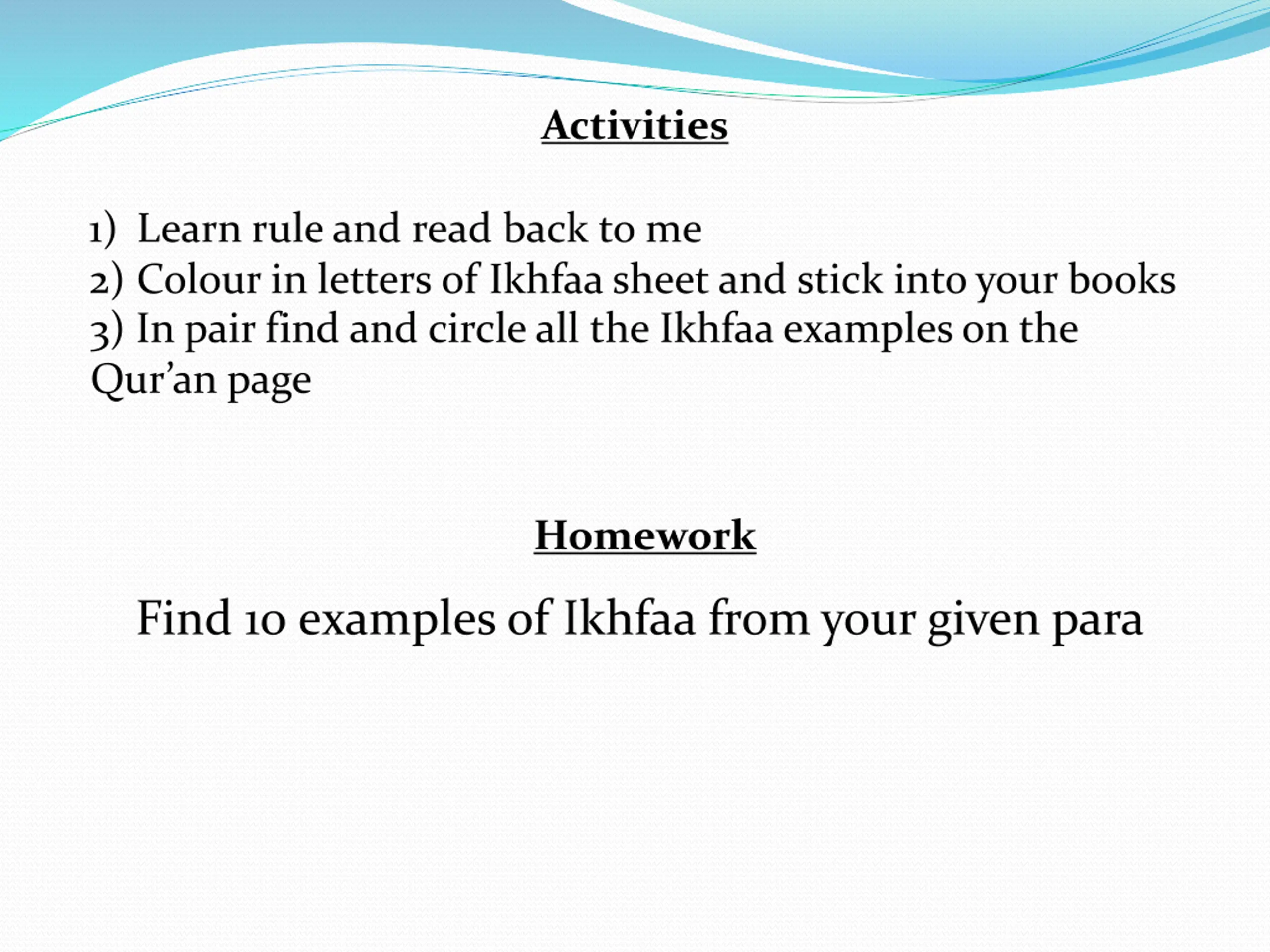 Activities 1) Learn rule and read back to me 2) Colour in letters of Ikhfaa sheet and stick into your books 3) In pair find and circle all the Ikhfaa examples on the Qur an page Homework Find 10 examples of Ikhfaa from your given para