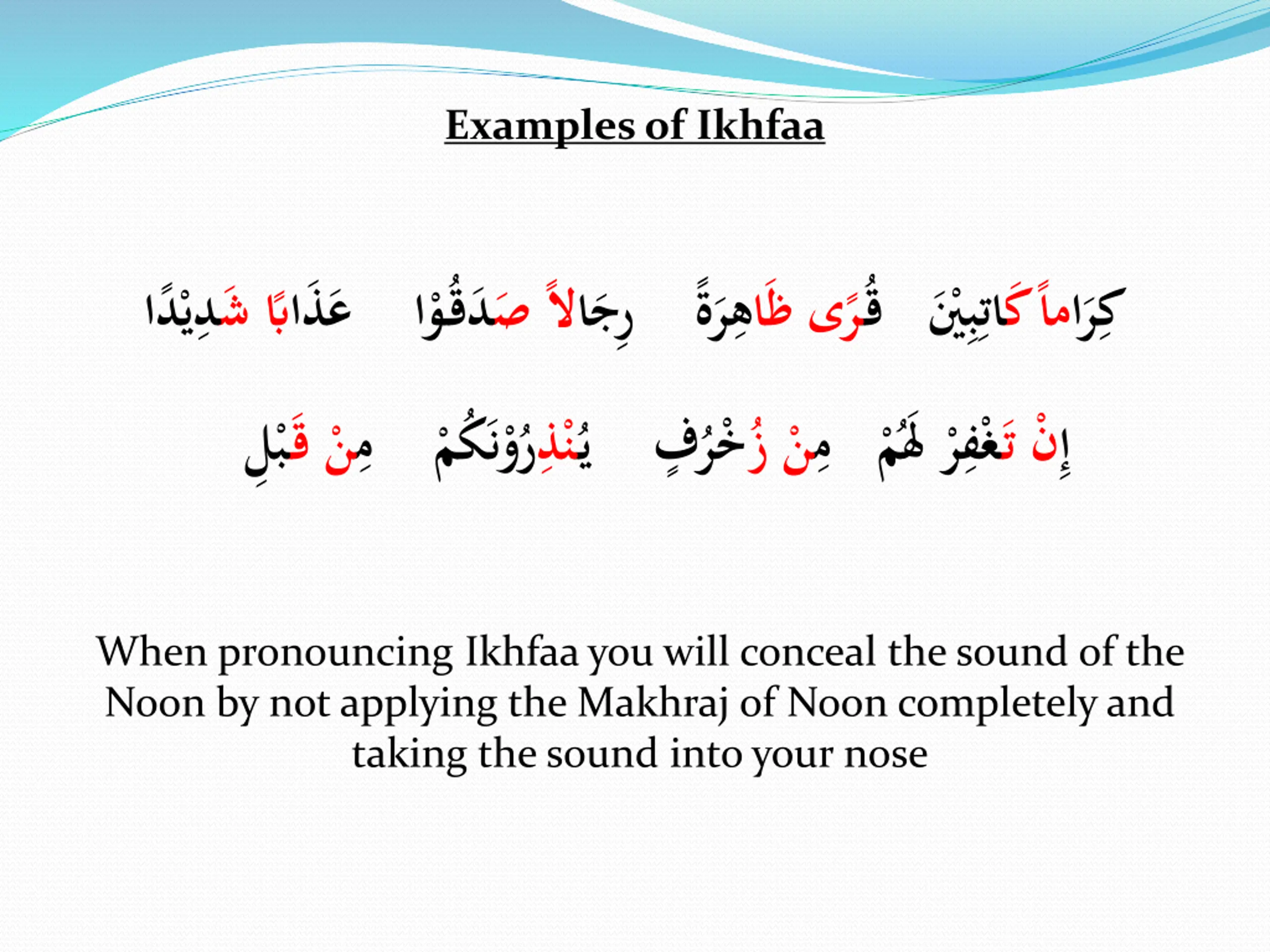 Examples of Ikhfaa When pronouncing Ikhfaa you will conceal the sound of the Noon by not applying the Makhraj of Noon completely and taking the sound into your nose