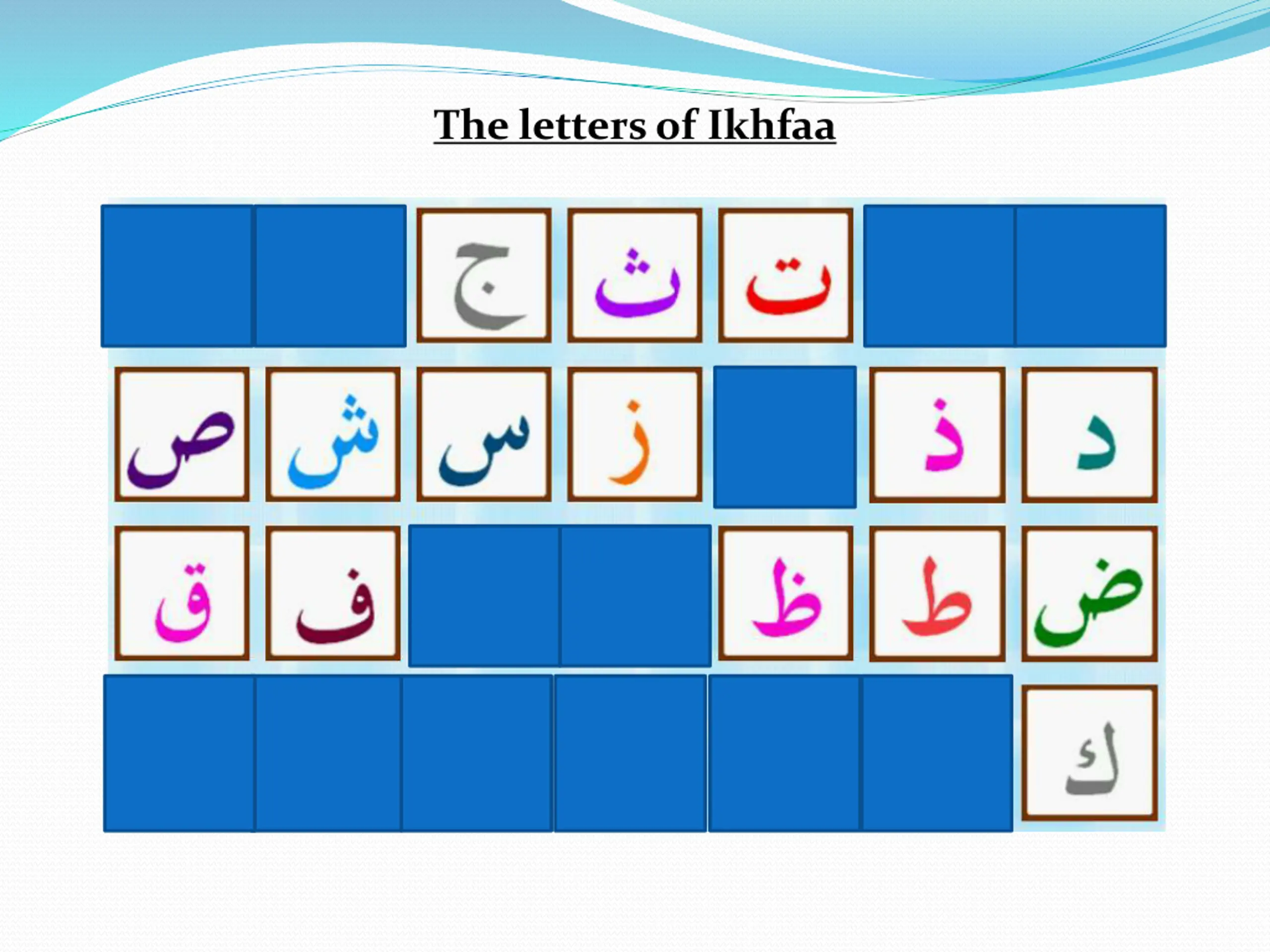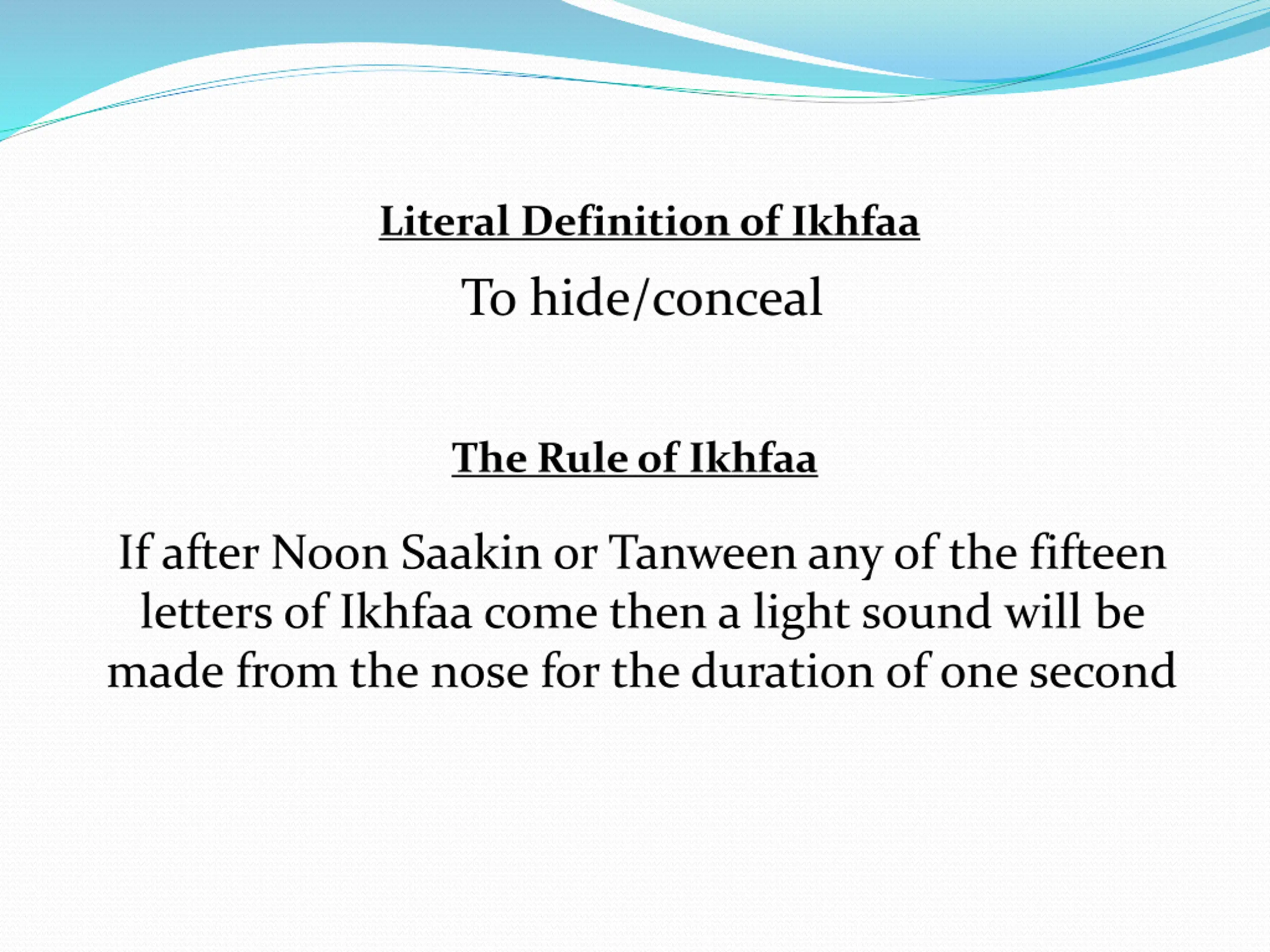 Literal Definition of Ikhfaa To hide/conceal The Rule of Ikhfaa If after Noon Saakin or Tanween any of the fifteen letters of Ikhfaa come then a light sound will be made from the nose for the duration of one second