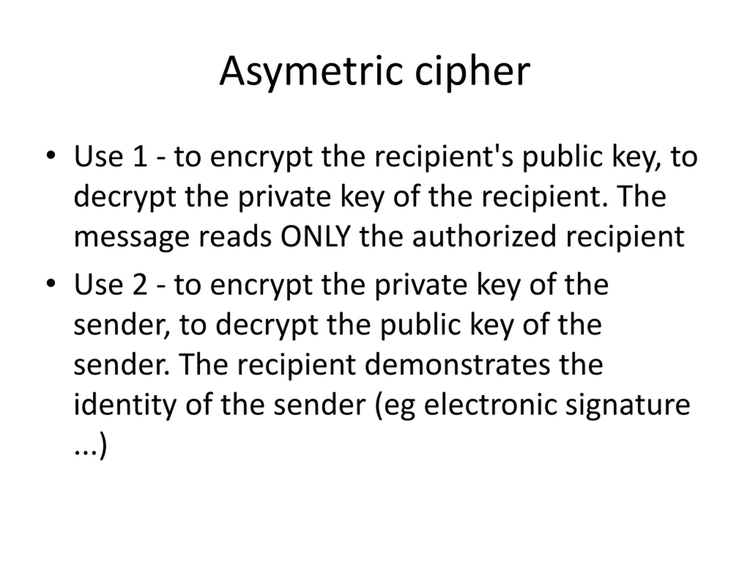 Asymetric cipher Use 1 - to encrypt the recipient's public key, to decrypt the private key of the recipient. The message reads ONLY the authorized recipient Use 2 - to encrypt the private key of the sender, to decrypt the public key of the sender. The recipient demonstrates the identity of the sender (eg electronic signature ...)