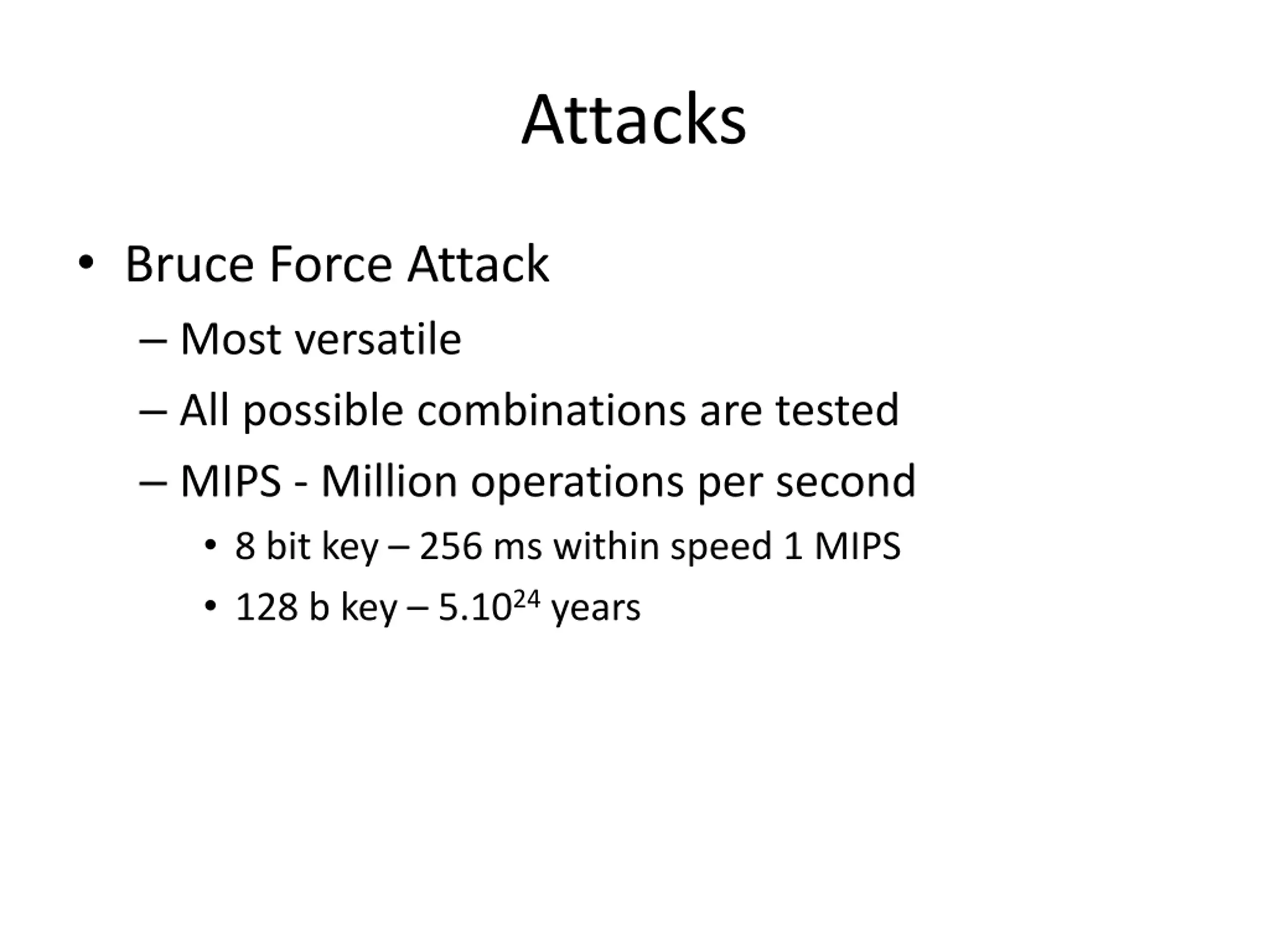 Attacks Bruce Force Attack Most versatile All possible combinations are tested MIPS - Million operations per second 8 bit key 256 ms within speed 1 MIPS 128 b key 5.1024 years