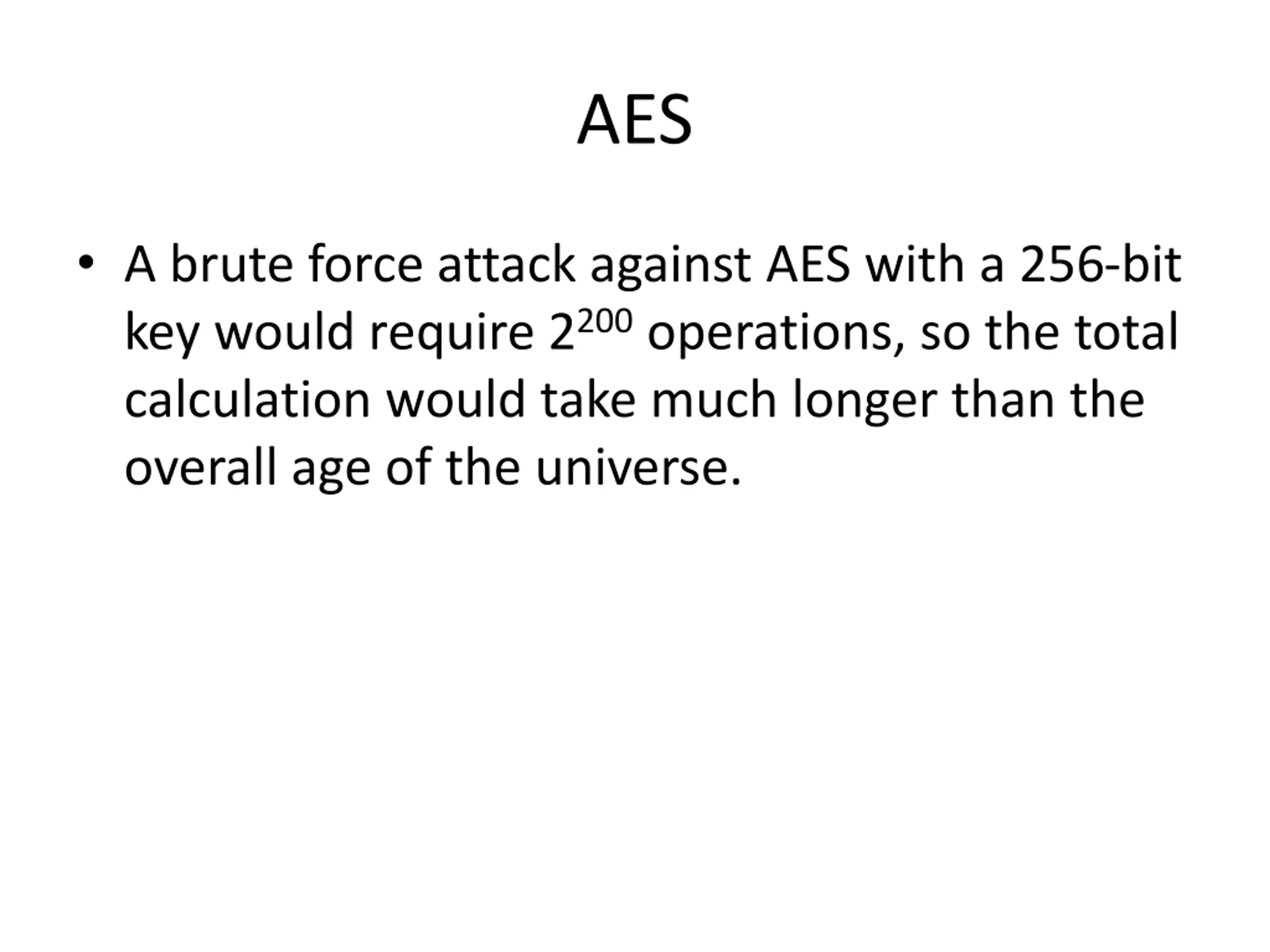 AES A brute force attack against AES with a 256-bit key would require 2200operations, so the total calculation would take much longer than the overall age of the universe.