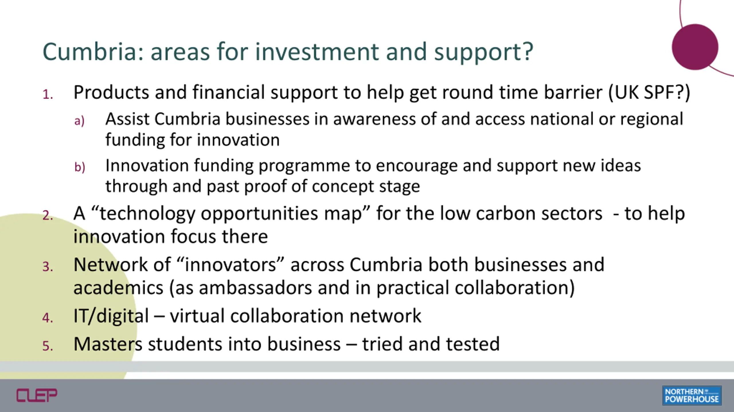 - Cumbria: areas for investment and support? Products and financial support to help get round time barrier (UK SPF?) Assist Cumbria businesses in awareness of and access national or regional funding for innovation Innovation funding programme to encourage and support new ideas through and past proof of concept stage A technology opportunities map for the low carbon sectors - to help innovation focus there Network of innovators across Cumbria both businesses and academics (as ambassadors and in practical collaboration) IT/digital virtual collaboration network Masters students into business tried and tested 1. a) b) 2. 3. 4. 5.