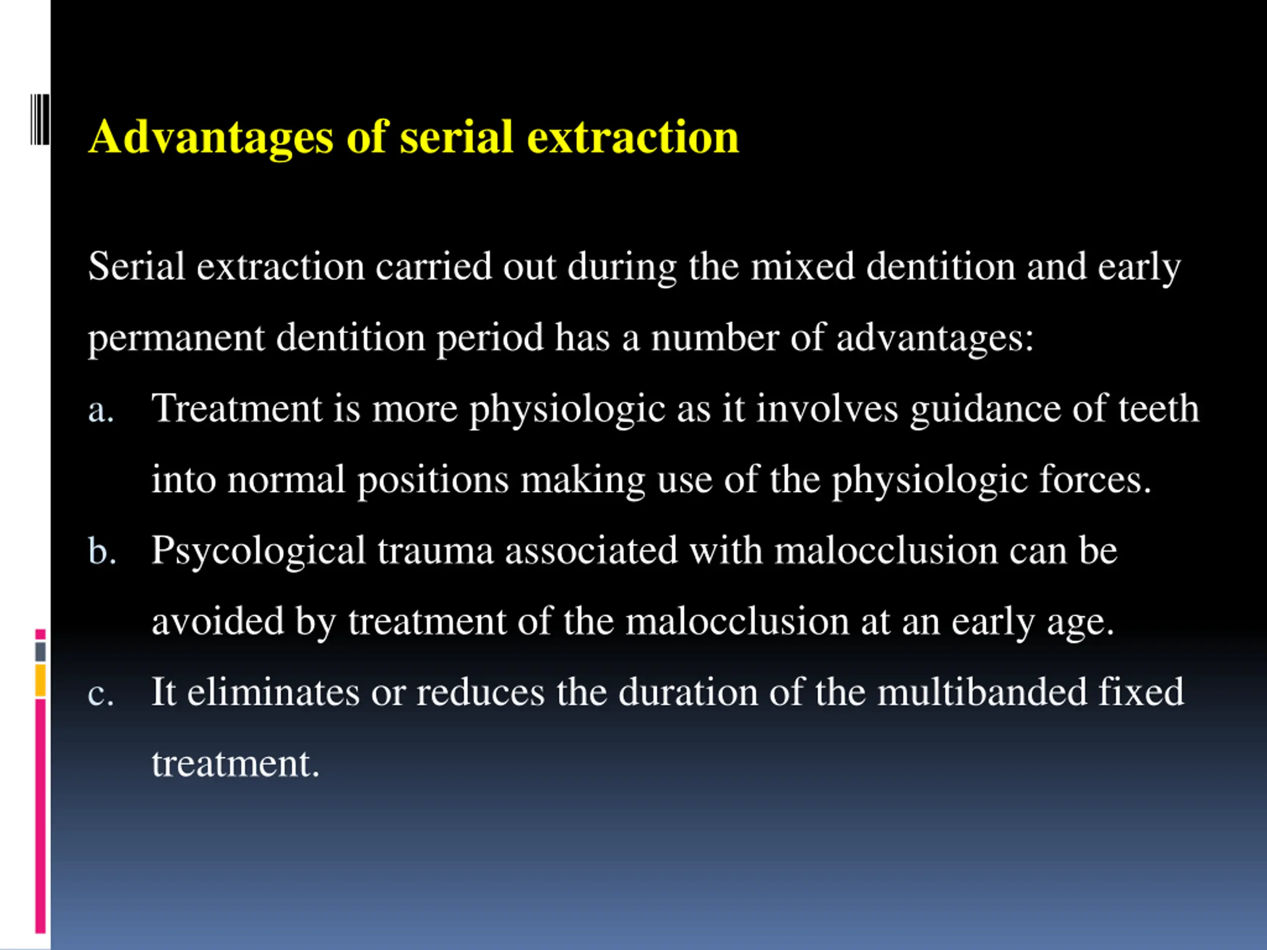 Advantages of serial extraction Serial extraction carried out during the mixed dentition and early permanent dentition period has a number of advantages: a. Treatment is more physiologic as it involves guidance of teeth into normal positions making use of the physiologic forces. b. Psycological trauma associated with malocclusion can be avoided by treatment of the malocclusion at an early age. c. It eliminates or reduces the duration of the multibanded fixed treatment.