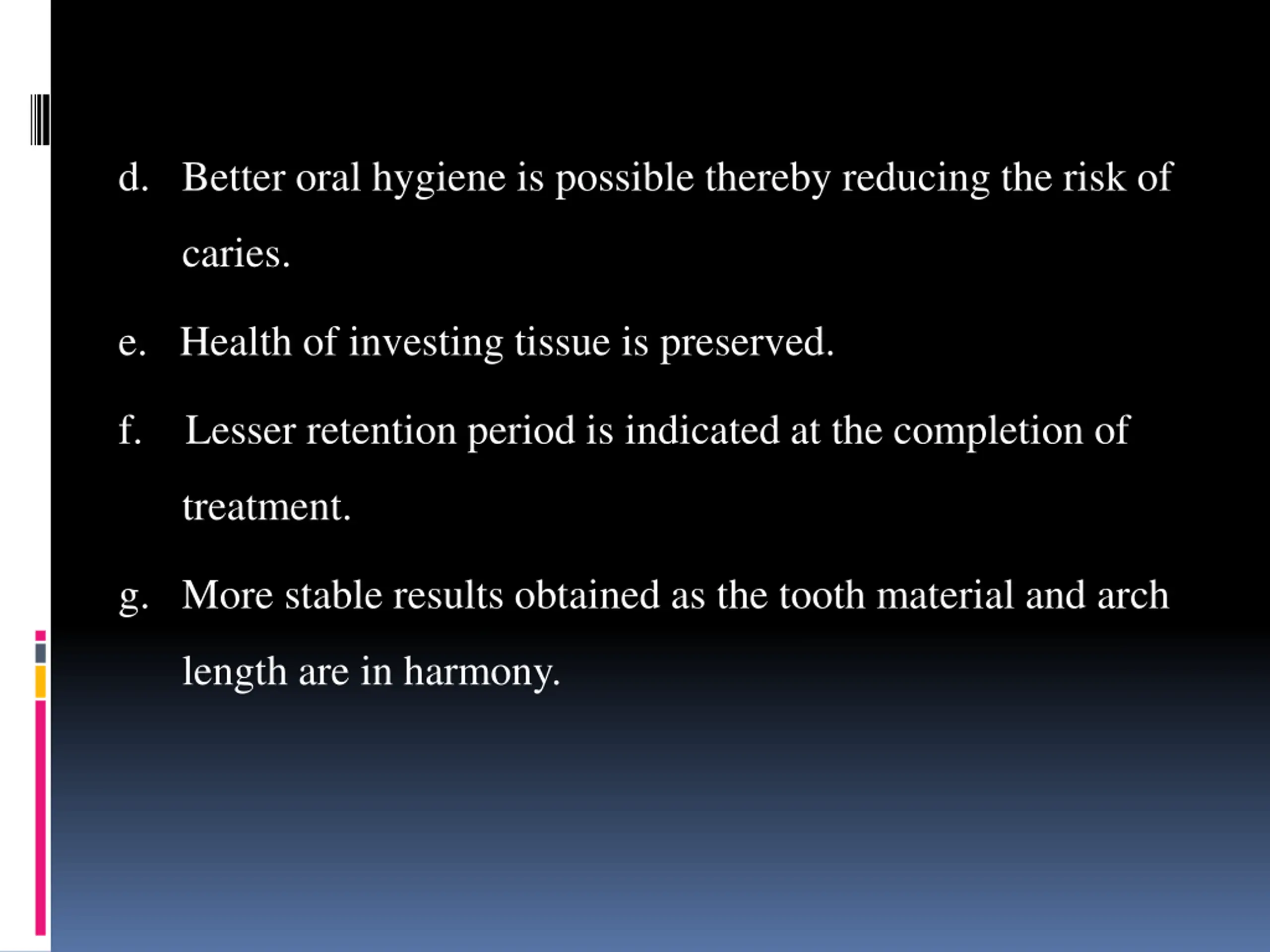 d. Better oral hygiene is possible thereby reducing the risk of caries. e. Health of investing tissue is preserved. f. Lesser retention period is indicated at the completion of treatment. g. More stable results obtained as the tooth material and arch length are in harmony.