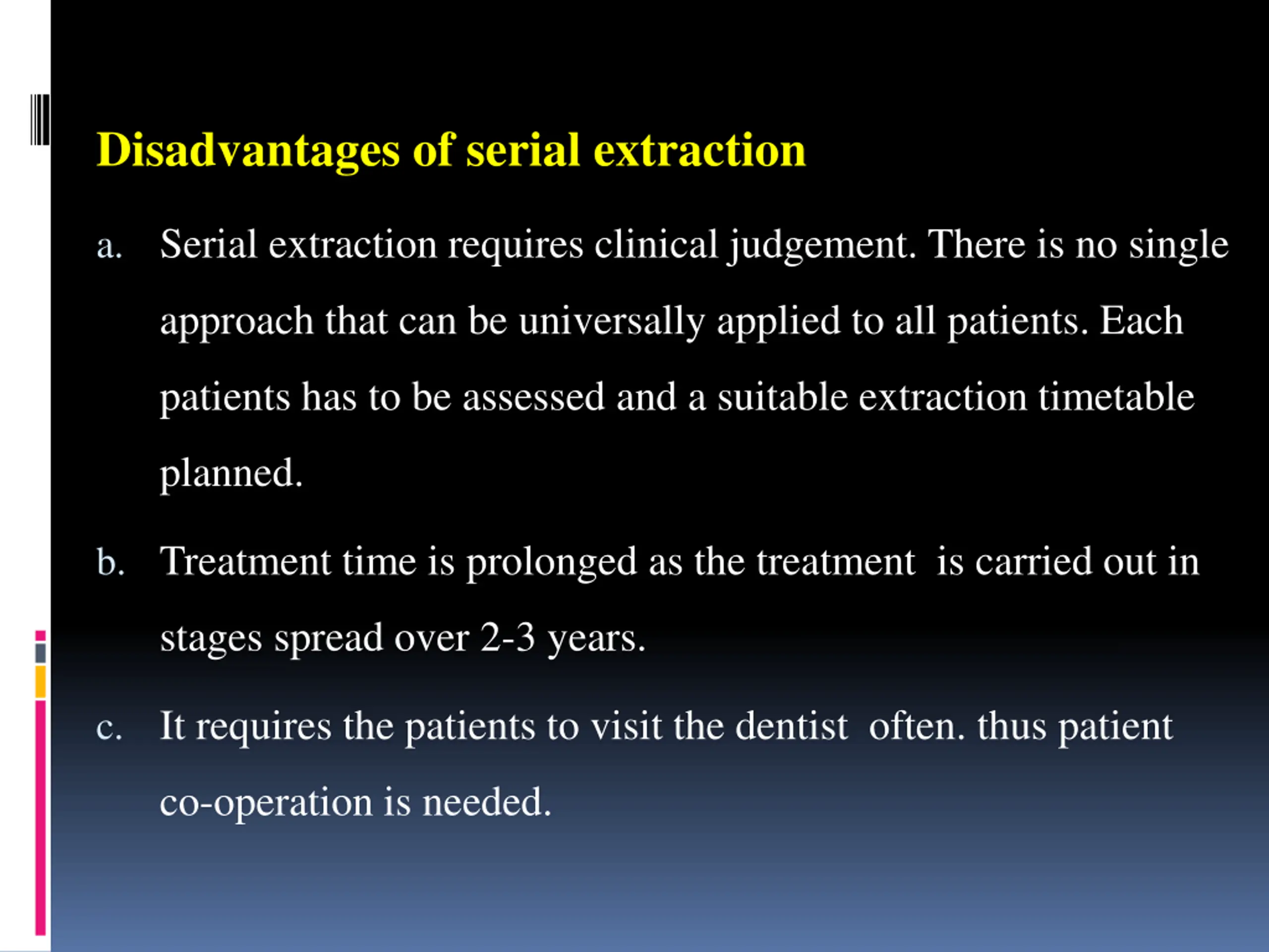 Disadvantages of serial extraction a. Serial extraction requires clinical judgement. There is no single approach that can be universally applied to all patients. Each patients has to be assessed and a suitable extraction timetable planned. b. Treatment time is prolonged as the treatment is carried out in stages spread over 2-3 years. c. It requires the patients to visit the dentist often. thus patient co-operation is needed.