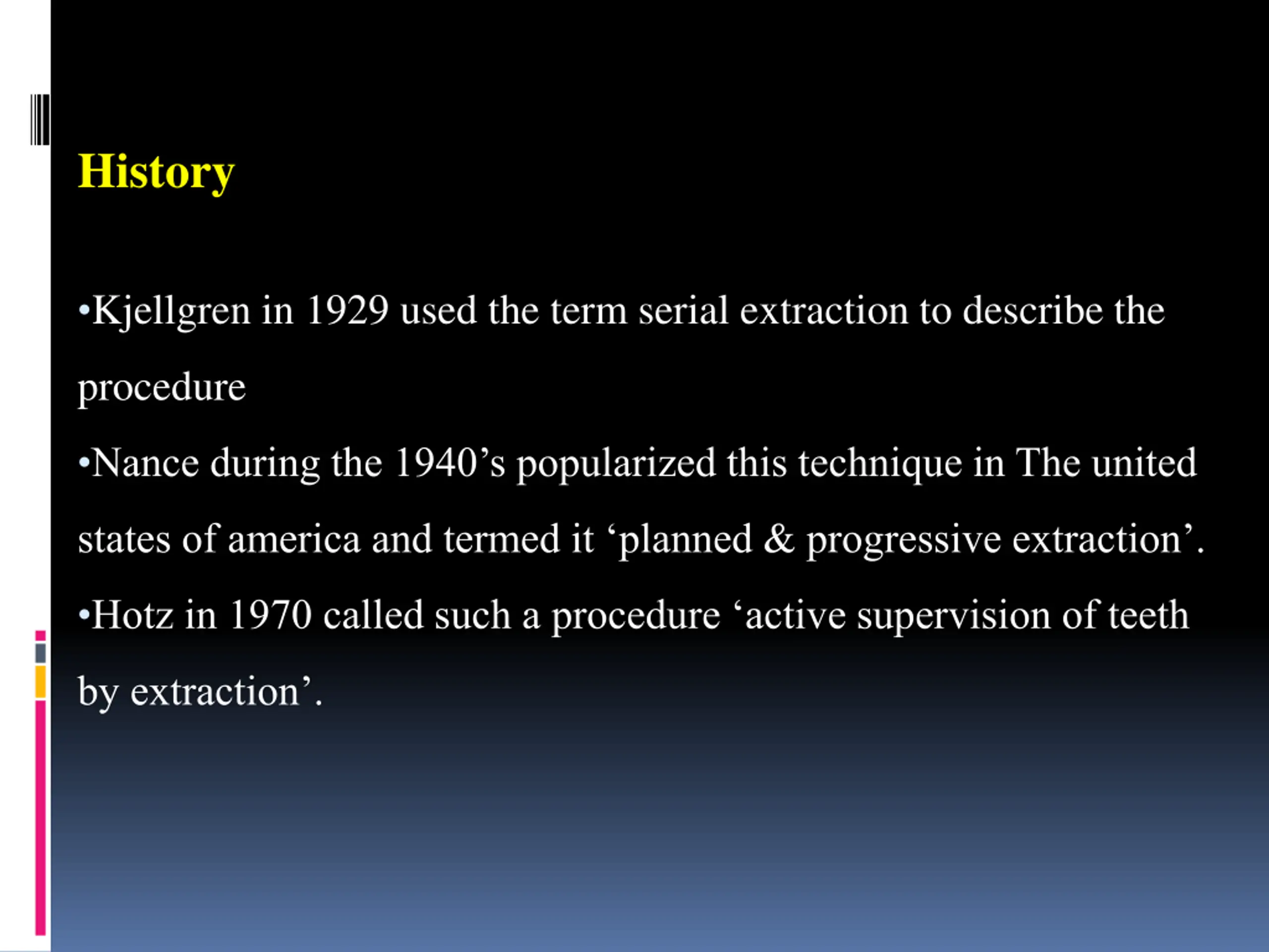 History Kjellgren in 1929 used the term serial extraction to describe the procedure Nance during the 1940 s popularized this technique in The united states of america and termed it planned & progressive extraction . Hotz in 1970 called such a procedure active supervision of teeth by extraction .
