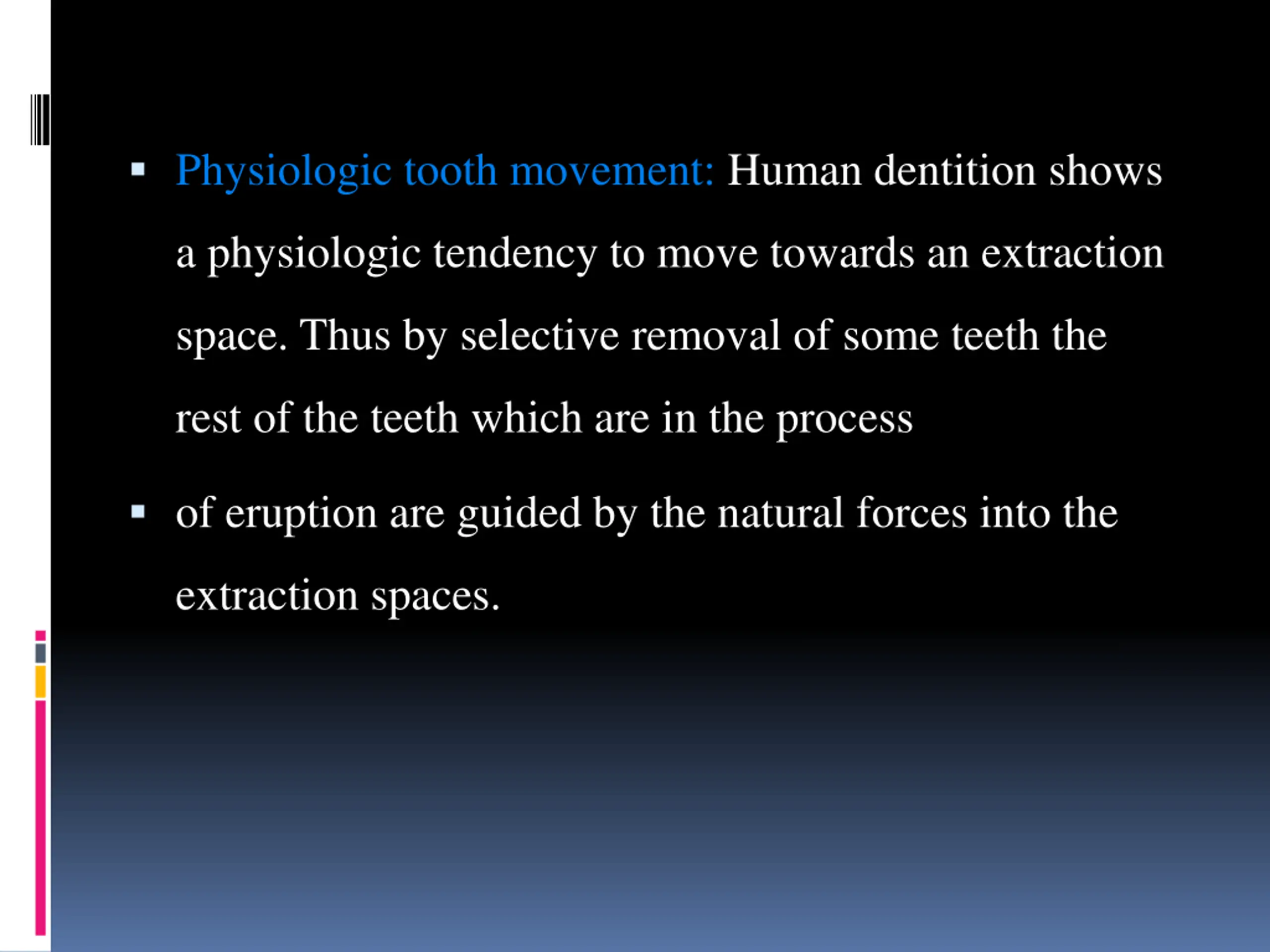 Physiologic tooth movement: Human dentition shows a physiologic tendency to move towards an extraction space. Thus by selective removal of some teeth the rest of the teeth which are in the process of eruption are guided by the natural forces into the extraction spaces.