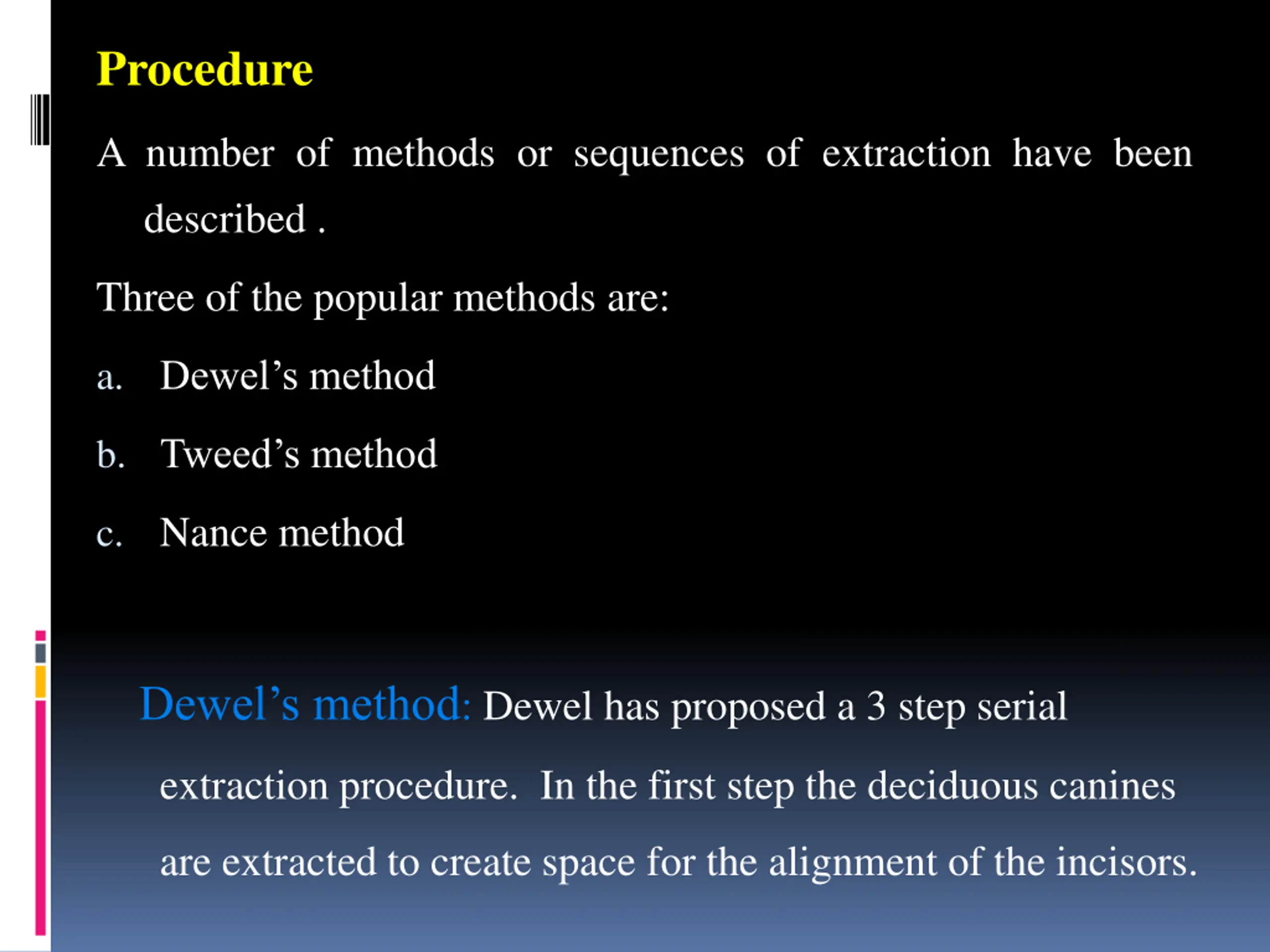 Procedure A number of methods or sequences of extraction have been described . Three of the popular methods are: a. Dewel s method b. Tweed s method c. Nance method Dewel s method: Dewel has proposed a 3 step serial extraction procedure. In the first step the deciduous canines are extracted to create space for the alignment of the incisors.