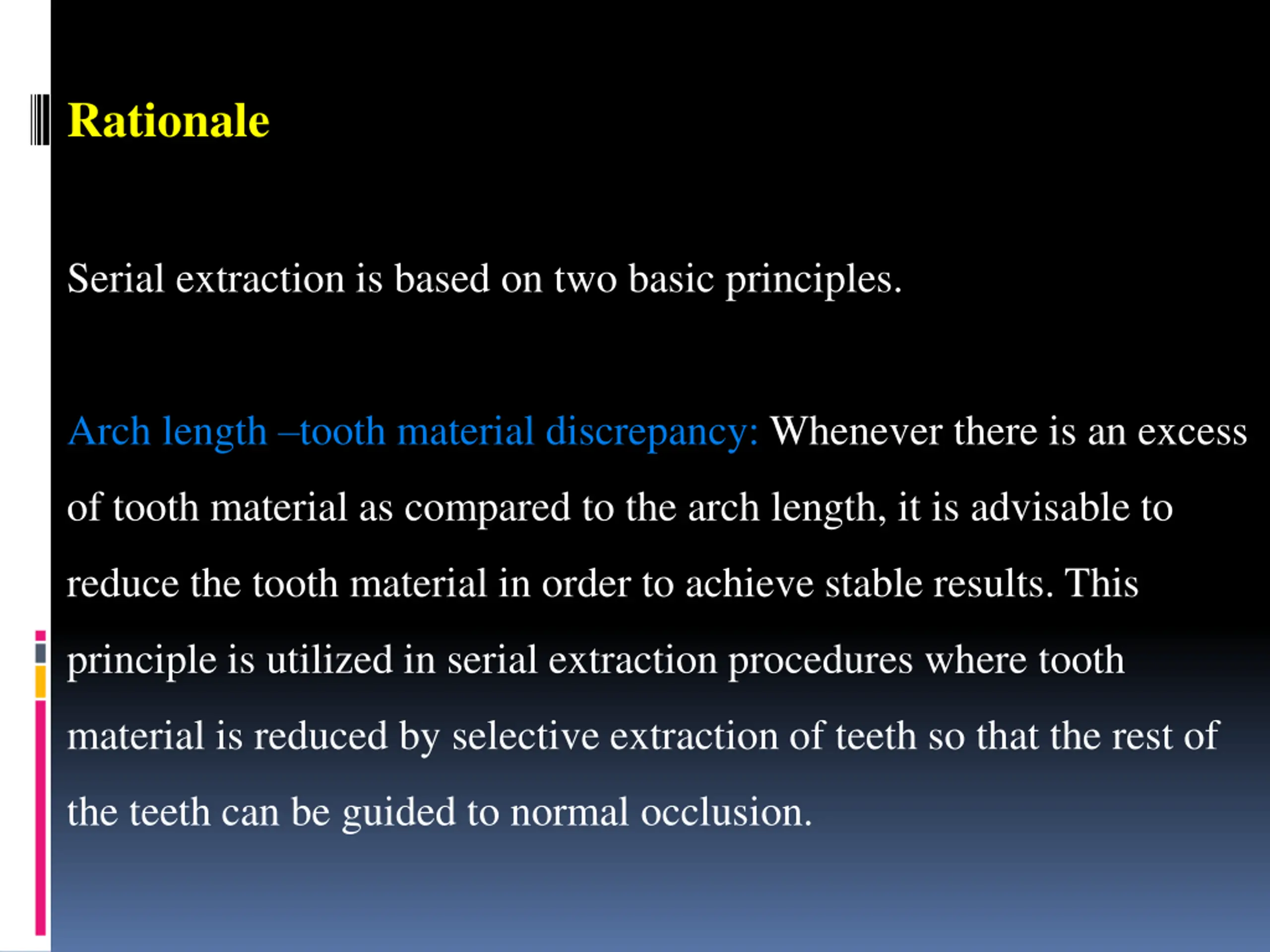 Rationale Serial extraction is based on two basic principles. Arch length tooth material discrepancy: Whenever there is an excess of tooth material as compared to the arch length, it is advisable to reduce the tooth material in order to achieve stable results. This principle is utilized in serial extraction procedures where tooth material is reduced by selective extraction of teeth so that the rest of the teeth can be guided to normal occlusion.