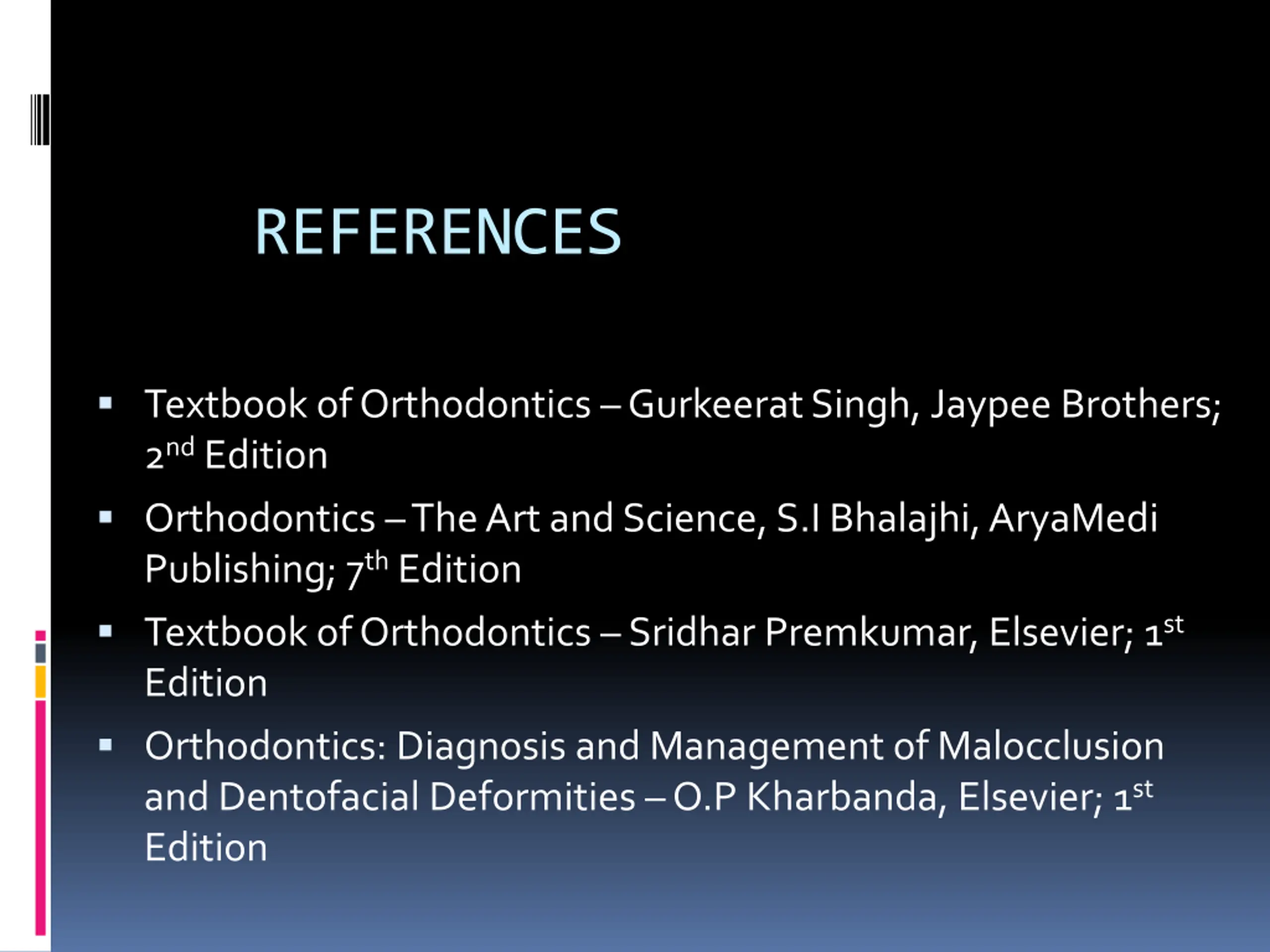 REFERENCES Textbook of Orthodontics Gurkeerat Singh, Jaypee Brothers; 2nd Edition Orthodontics The Art and Science, S.I Bhalajhi, AryaMedi Publishing; 7th Edition Textbook of Orthodontics Sridhar Premkumar, Elsevier; 1st Edition Orthodontics: Diagnosis and Management of Malocclusion and Dentofacial Deformities O.P Kharbanda, Elsevier; 1st Edition