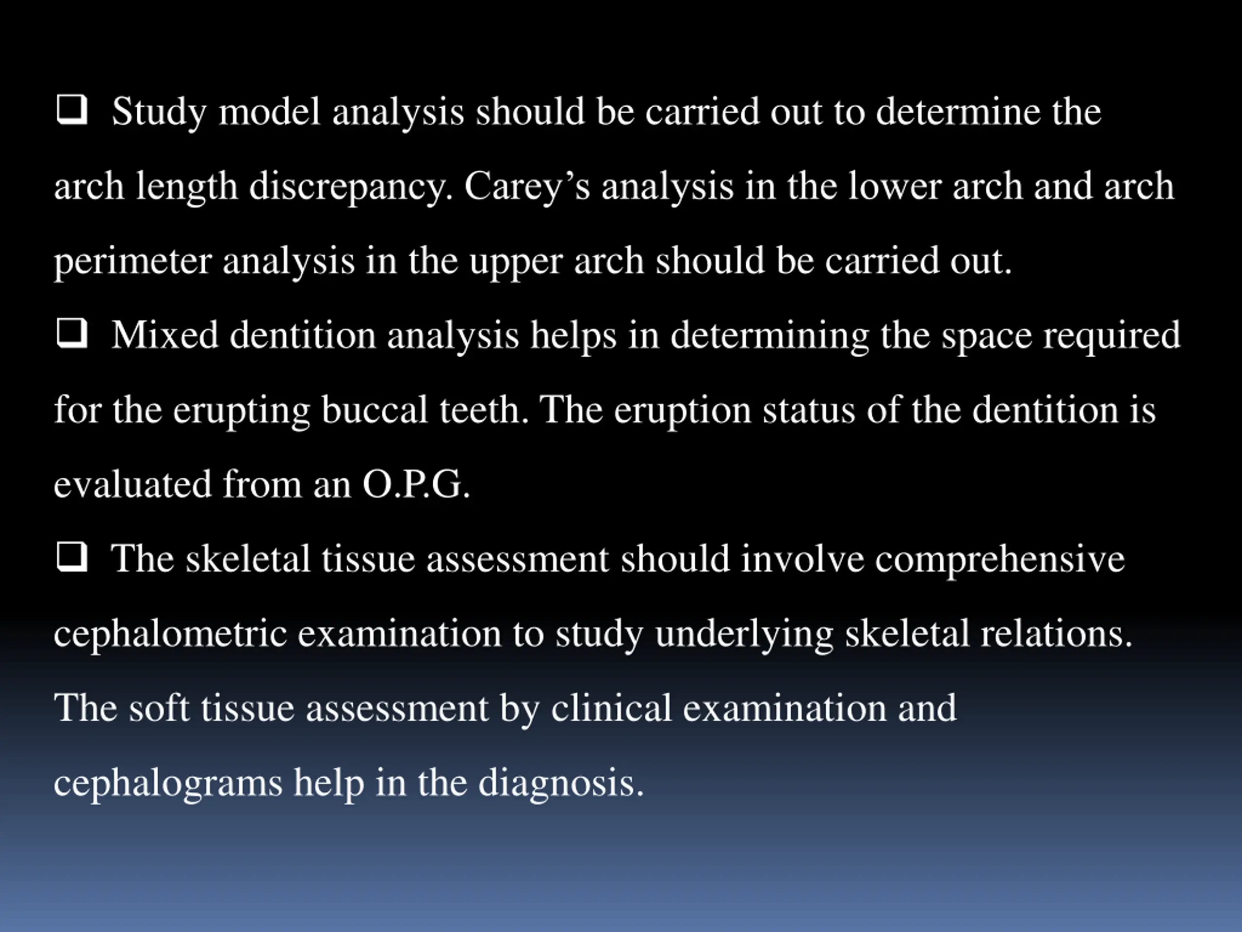 Study model analysis should be carried out to determine the arch length discrepancy. Carey s analysis in the lower arch and arch perimeter analysis in the upper arch should be carried out. Mixed dentition analysis helps in determining the space required for the erupting buccal teeth. The eruption status of the dentition is evaluated from an O.P.G. The skeletal tissue assessment should involve comprehensive cephalometric examination to study underlying skeletal relations. The soft tissue assessment by clinical examination and cephalograms help in the diagnosis.