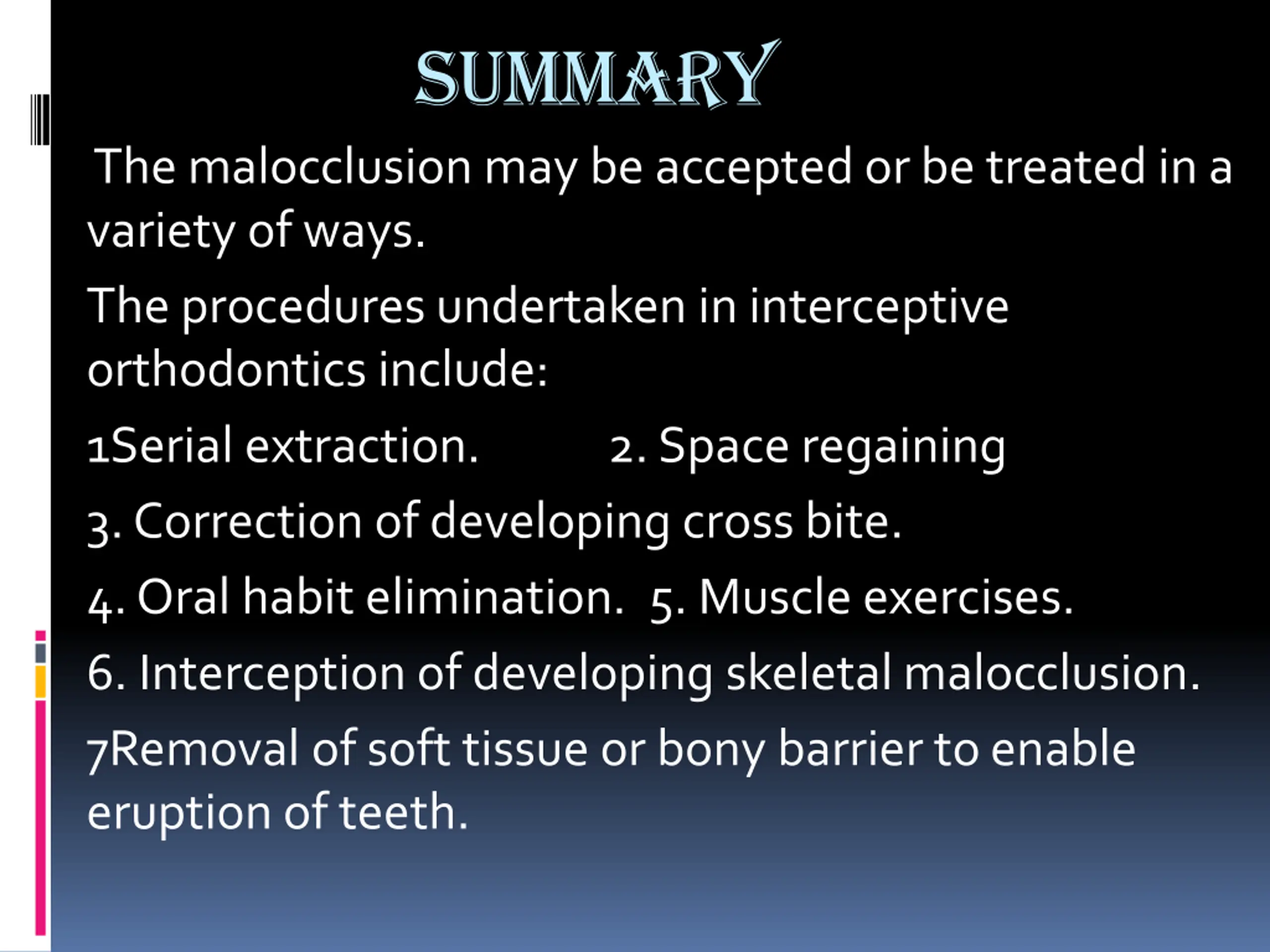 SUMMARY The malocclusion may be accepted or be treated in a variety of ways. The procedures undertaken in interceptive orthodontics include: 1Serial extraction. 2. Space regaining 3. Correction of developing cross bite. 4. Oral habit elimination. 5. Muscle exercises. 6. Interception of developing skeletal malocclusion. 7Removal of soft tissue or bony barrier to enable eruption of teeth.
