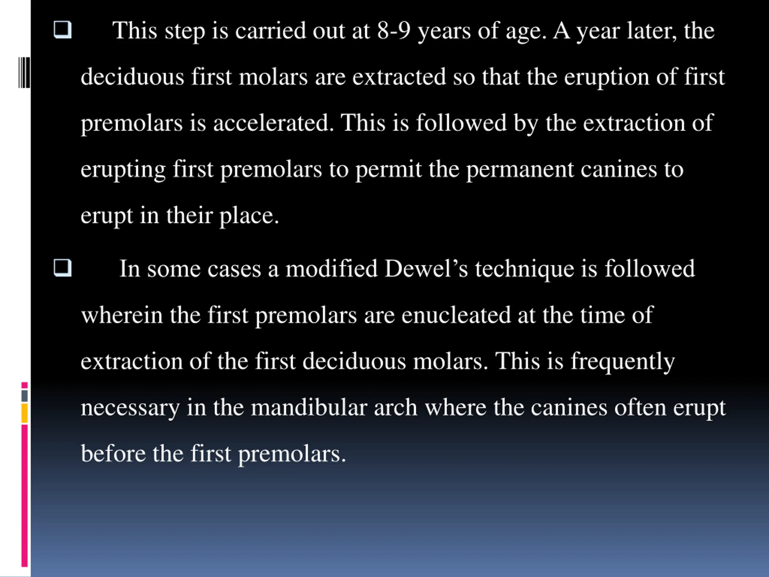 This step is carried out at 8-9 years of age. A year later, the deciduous first molars are extracted so that the eruption of first premolars is accelerated. This is followed by the extraction of erupting first premolars to permit the permanent canines to erupt in their place. In some cases a modified Dewel s technique is followed wherein the first premolars are enucleated at the time of extraction of the first deciduous molars. This is frequently necessary in the mandibular arch where the canines often erupt before the first premolars.
