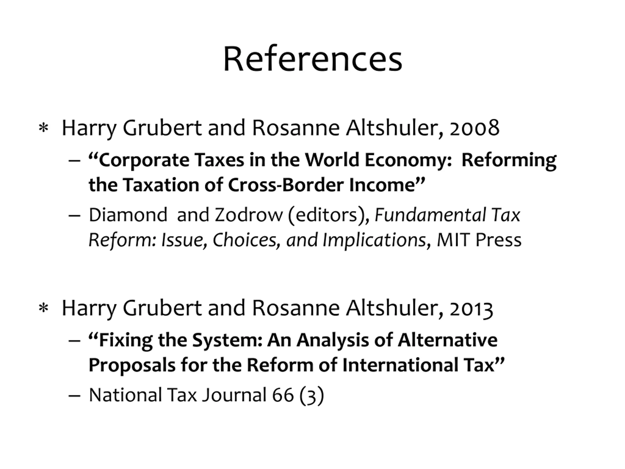 References Harry Grubert and Rosanne Altshuler, 2008 Corporate Taxes in the World Economy: Reforming the Taxation of Cross-Border Income Diamond and Zodrow (editors), Fundamental Tax Reform: Issue, Choices, and Implications, MIT Press Harry Grubert and Rosanne Altshuler, 2013 Fixing the System: An Analysis of Alternative Proposals for the Reform of International Tax National Tax Journal 66 (3)