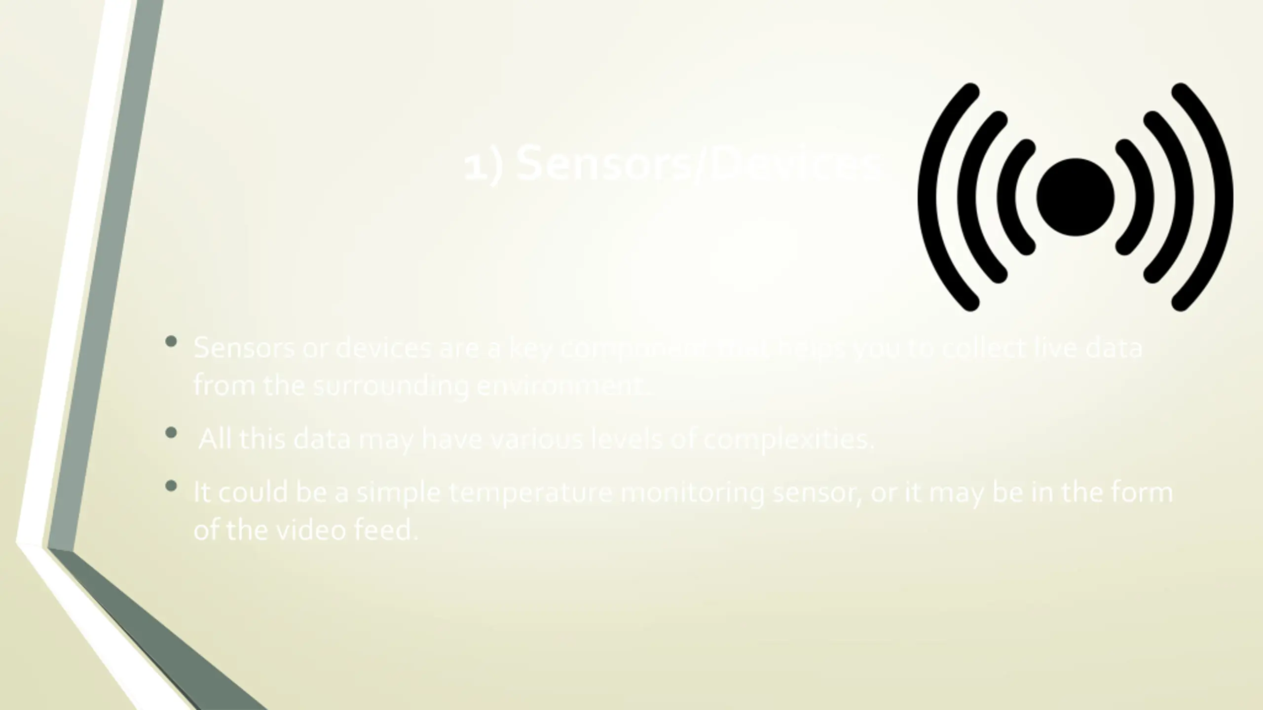1) Sensors/Devices Sensors or devices are a key component that helps you to collect live data from the surrounding environment. All this data may have various levels of complexities. It could be a simple temperature monitoring sensor, or it may be in the form of the video feed.