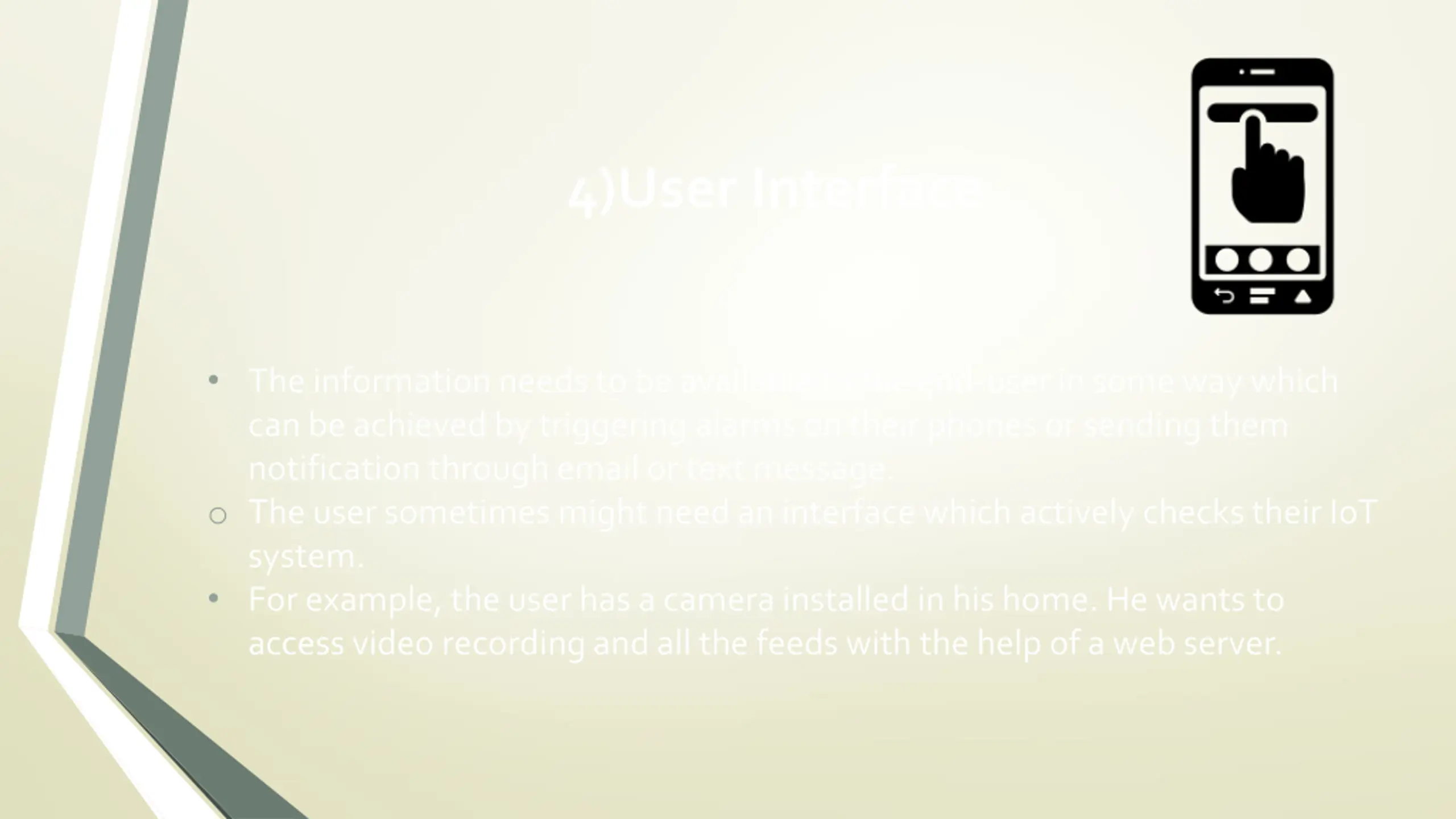 4)User Interface The information needs to be available to the end-user in some way which can be achieved by triggering alarms on their phones or sending them notification through email or text message. o The user sometimes might need an interface which actively checks their IoT system. For example, the user has a camera installed in his home. He wants to access video recording and all the feeds with the help of a web server.