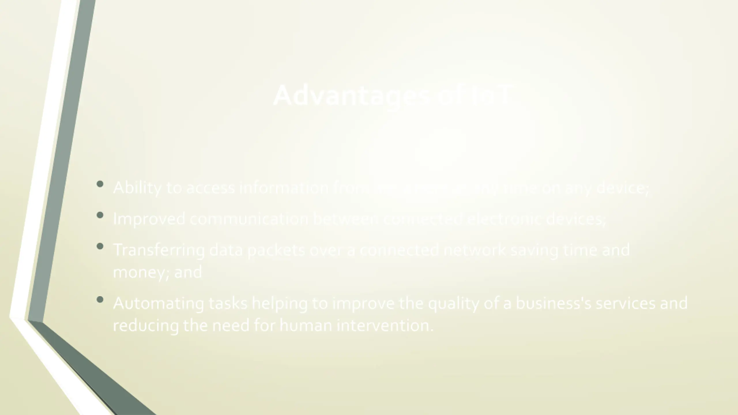 Advantages of IoT Ability to access information from anywhere at any time on any device; Improved communication between connected electronic devices; Transferring data packets over a connected network saving time and money; and Automating tasks helping to improve the quality of a business's services and reducing the need for human intervention.
