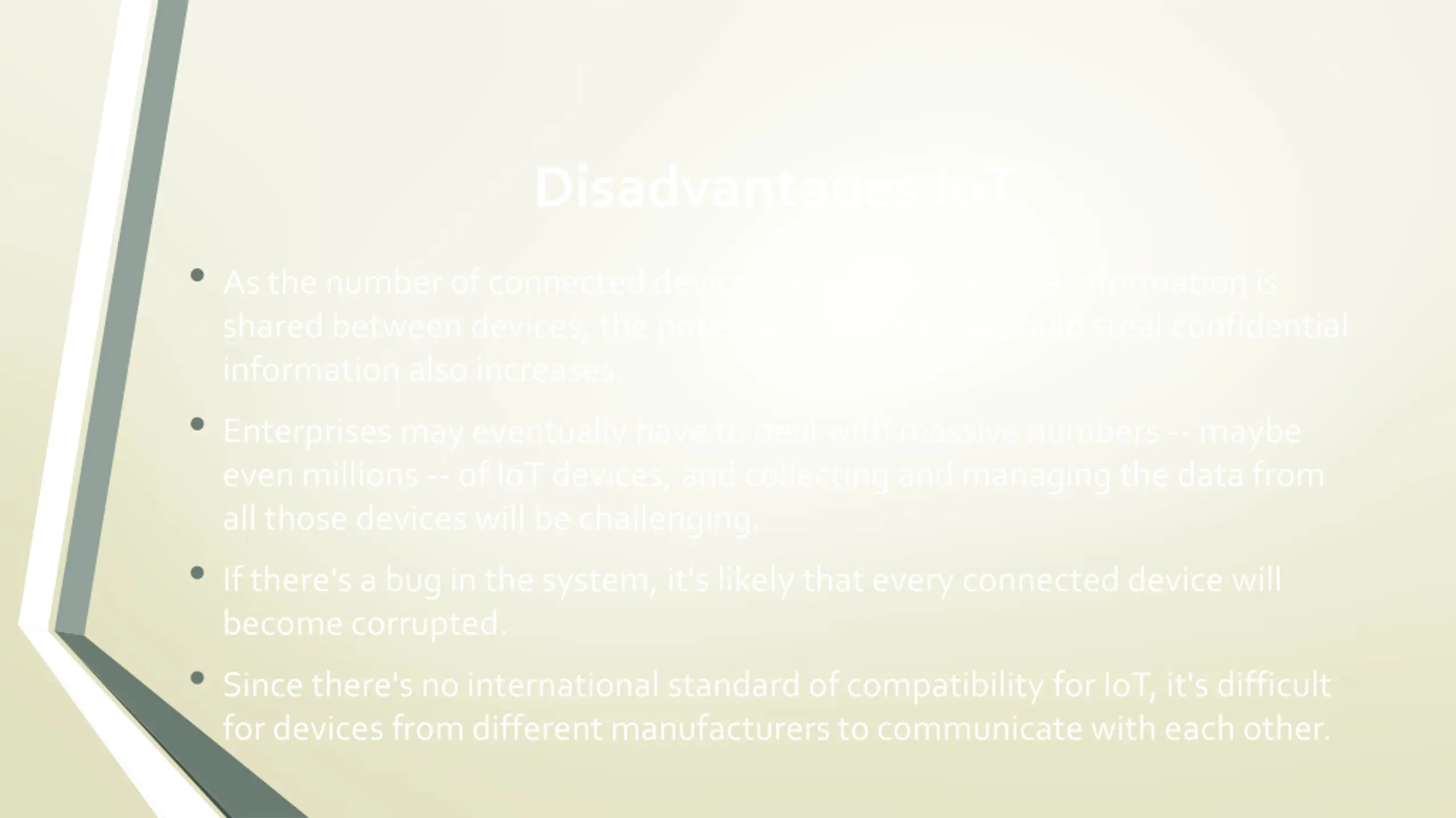 Disadvantages IoT As the number of connected devices increases and more information is shared between devices, the potential that a hacker could steal confidential information also increases. Enterprises may eventually have to deal with massive numbers -- maybe even millions -- of IoT devices, and collecting and managing the data from all those devices will be challenging. If there's a bug in the system, it's likely that every connected device will become corrupted. Since there's no international standard of compatibility for IoT, it's difficult for devices from different manufacturers to communicate with each other.