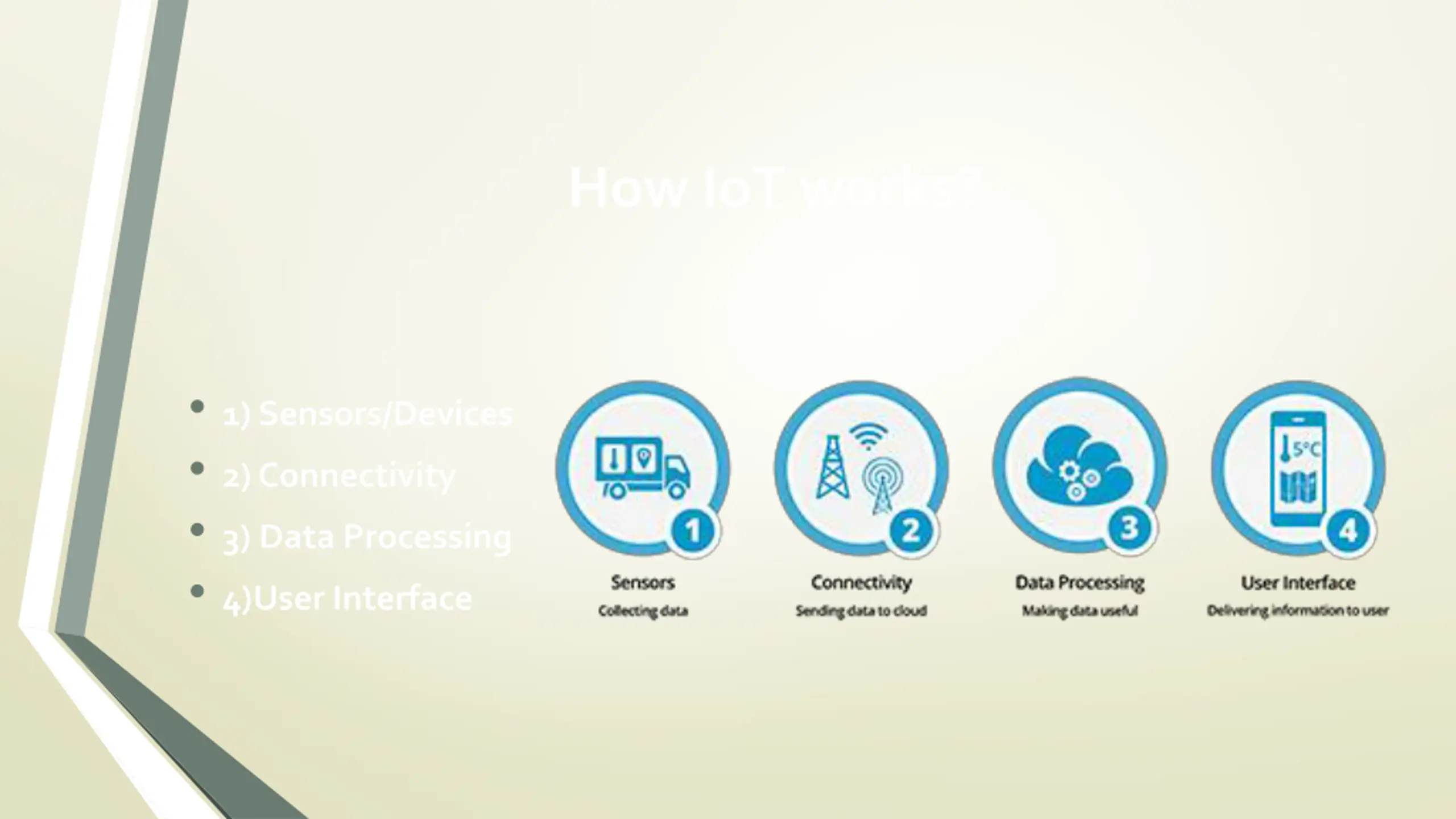 How IoT works? 1) Sensors/Devices 2) Connectivity 3) Data Processing 4)User Interface