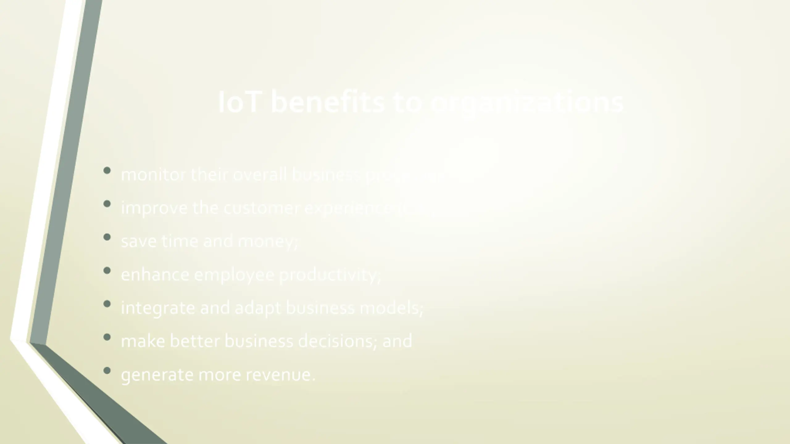 IoT benefits to organizations monitor their overall business processes; improve the customer experience (CX); save time and money; enhance employee productivity; integrate and adapt business models; make better business decisions; and generate more revenue.