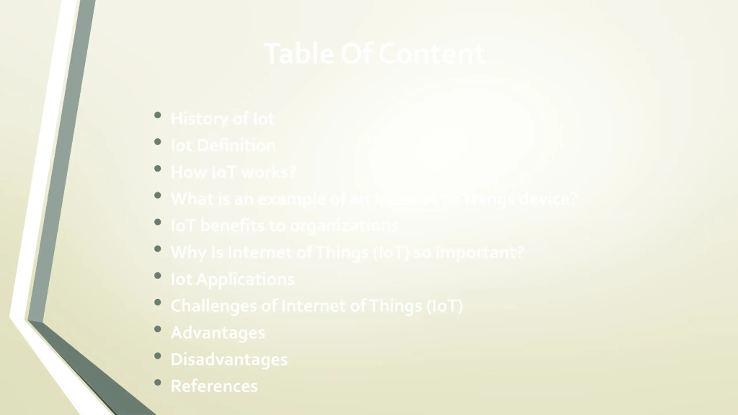 Table Of Content History of Iot Iot Definition How IoT works? What is an example of an Internet of Things device? IoT benefits to organizations Why Is Internet of Things (IoT) so important? Iot Applications Challenges of Internet of Things (IoT) Advantages Disadvantages References