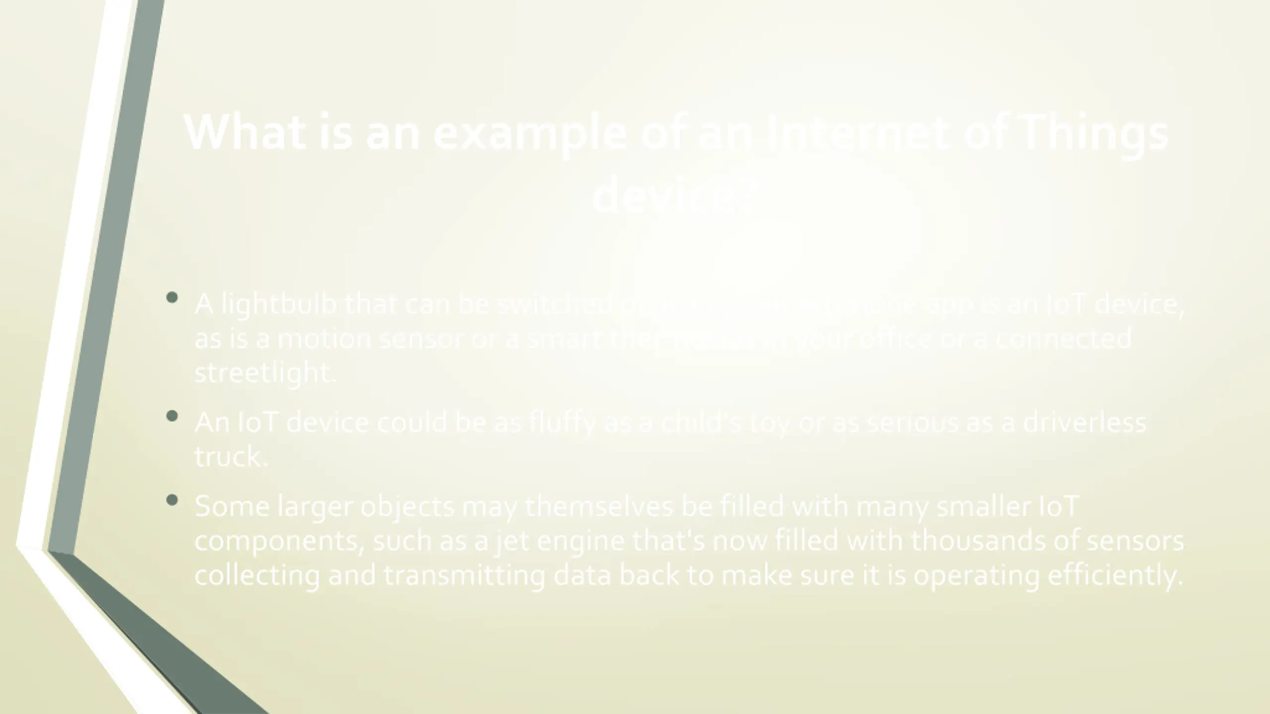 What is an example of an Internet of Things device? A lightbulb that can be switched on using a smartphone app is an IoT device, as is a motion sensor or a smart thermostat in your office or a connected streetlight. An IoT device could be as fluffy as a child's toy or as serious as a driverless truck. Some larger objects may themselves be filled with many smaller IoT components, such as a jet engine that's now filled with thousands of sensors collecting and transmitting data back to make sure it is operating efficiently.