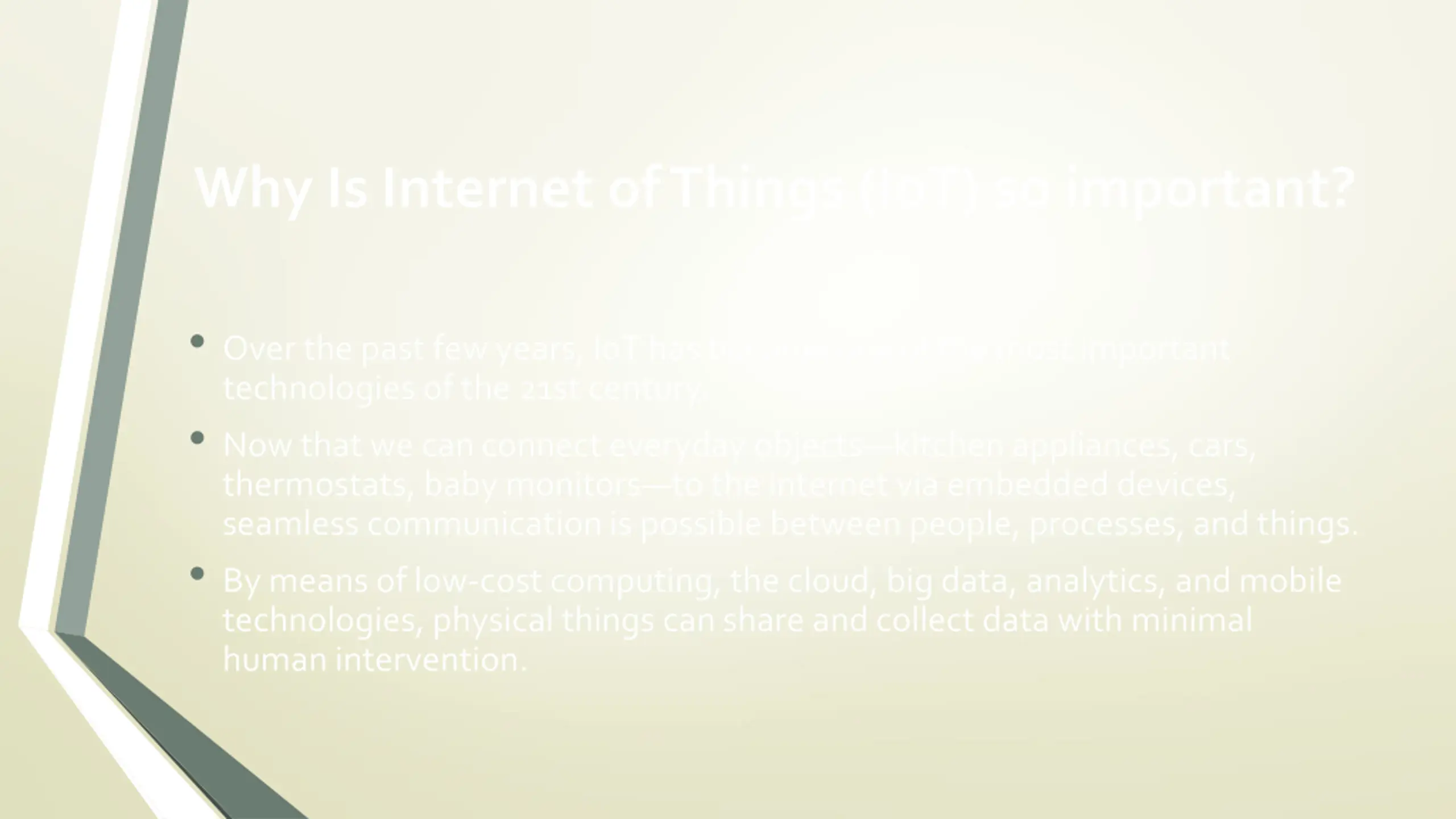 Why Is Internet of Things (IoT) so important? Over the past few years, IoT has become one of the most important technologies of the 21st century. Now that we can connect everyday objects kitchen appliances, cars, thermostats, baby monitors to the internet via embedded devices, seamless communication is possible between people, processes, and things. By means of low-cost computing, the cloud, big data, analytics, and mobile technologies, physical things can share and collect data with minimal human intervention.