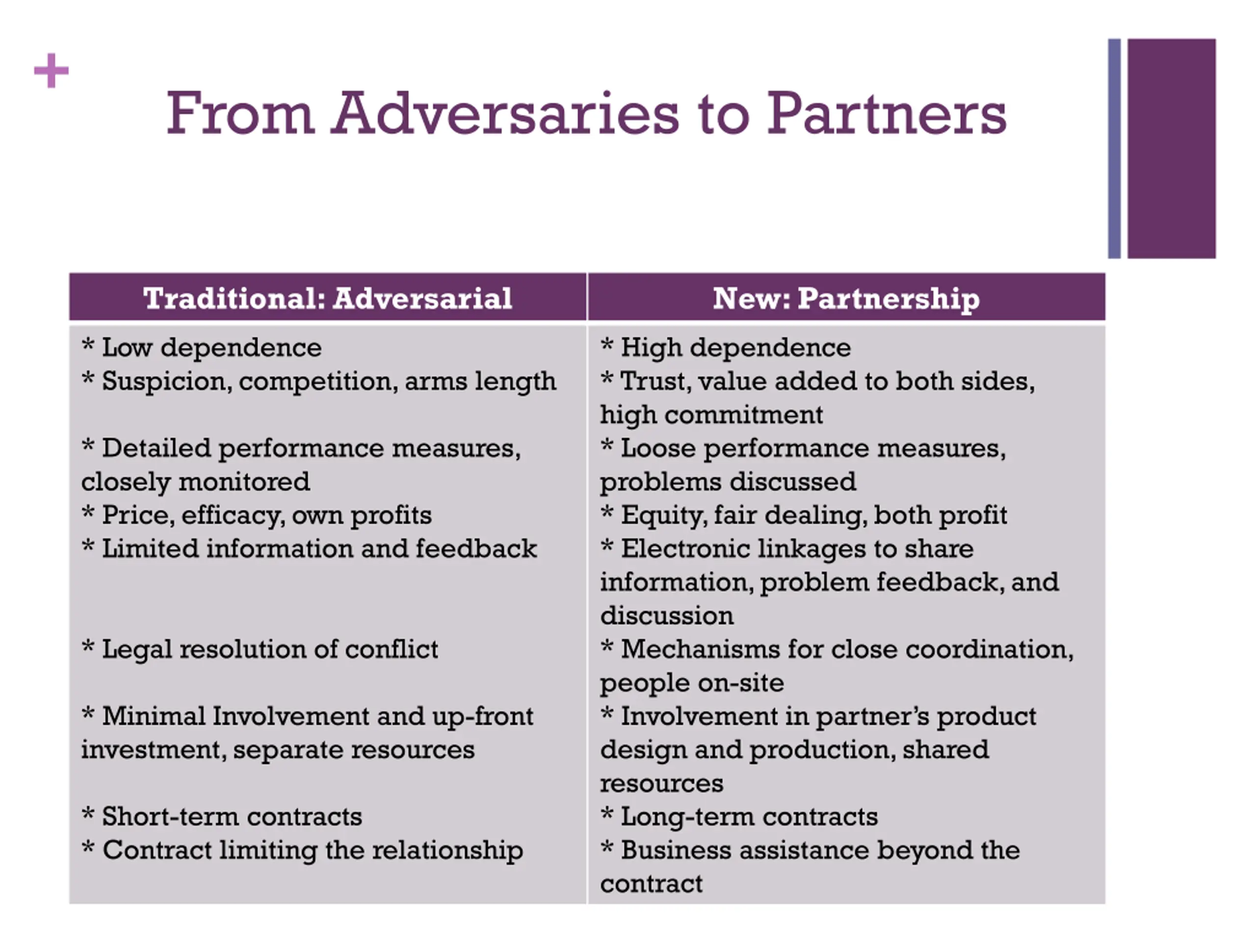 + From Adversaries to Partners Traditional: Adversarial New: Partnership * Low dependence * Suspicion, competition, arms length * High dependence * Trust, value added to both sides, high commitment * Loose performance measures, problems discussed * Equity, fair dealing, both profit * Electronic linkages to share information, problem feedback, and discussion * Mechanisms for close coordination, people on-site * Involvement in partner s product design and production, shared resources * Long-term contracts * Business assistance beyond the contract * Detailed performance measures, closely monitored * Price, efficacy, own profits * Limited information and feedback * Legal resolution of conflict * Minimal Involvement and up-front investment, separate resources * Short-term contracts * Contract limiting the relationship
