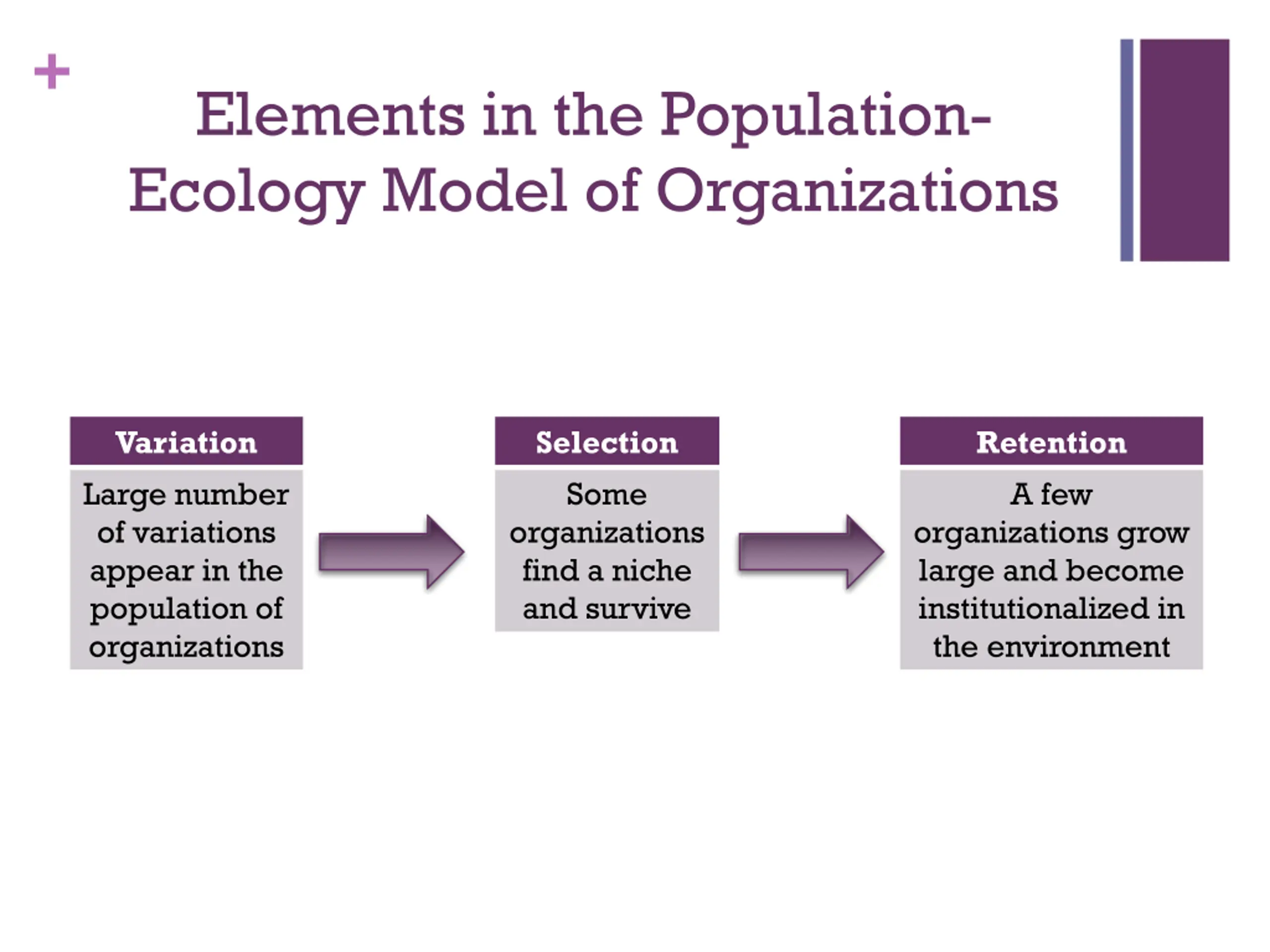 + Elements in the Population- Ecology Model of Organizations Variation Large number of variations appear in the population of organizations Selection Some organizations find a niche and survive Retention A few organizations grow large and become institutionalized in the environment