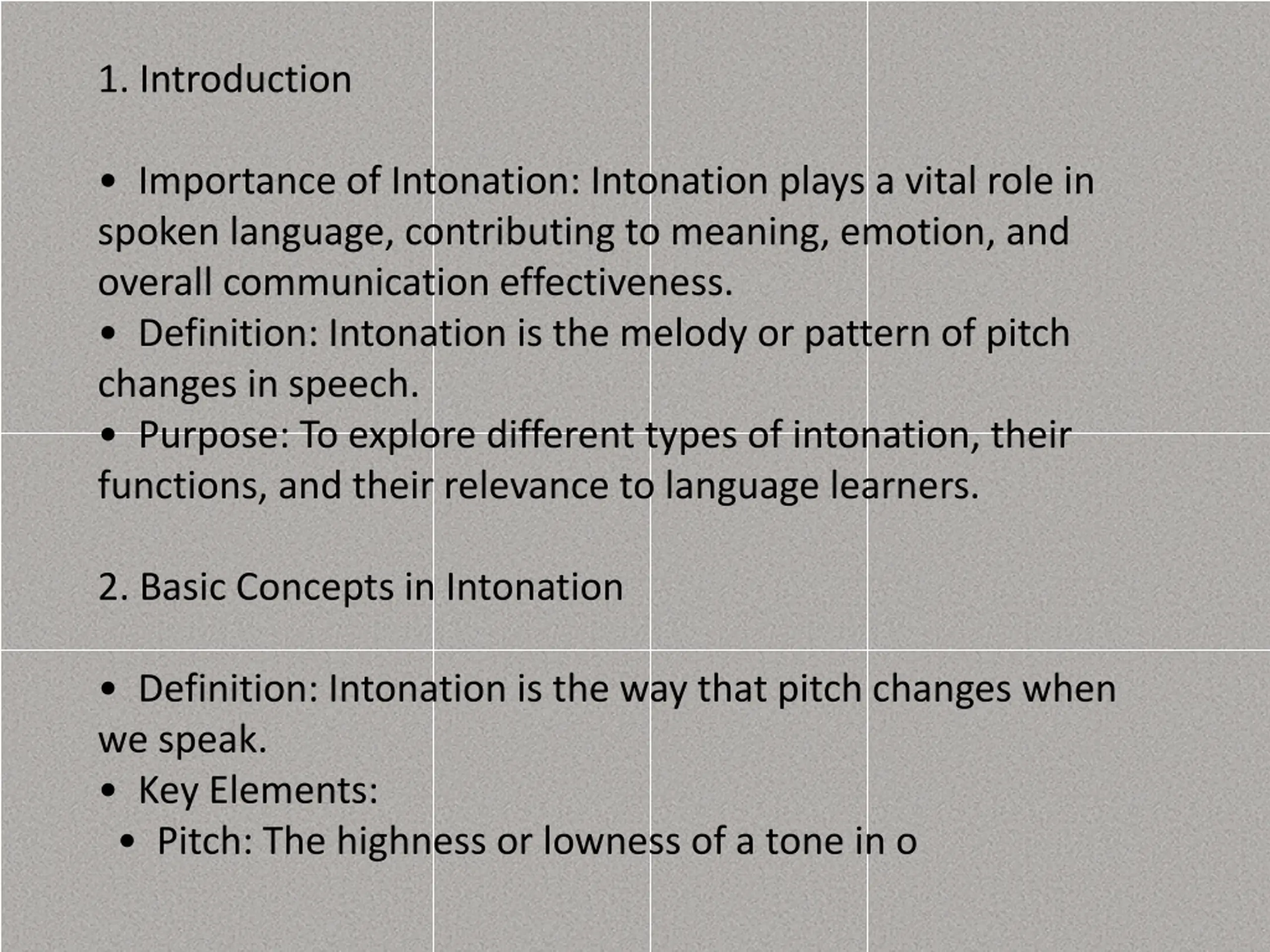 1. Introduction Importance of Intonation: Intonation plays a vital role in spoken language, contributing to meaning, emotion, and overall communication effectiveness. Definition: Intonation is the melody or pattern of pitch changes in speech. Purpose: To explore different types of intonation, their functions, and their relevance to language learners. 2. Basic Concepts in Intonation Definition: Intonation is the way that pitch changes when we speak. Key Elements: Pitch: The highness or lowness of a tone in o