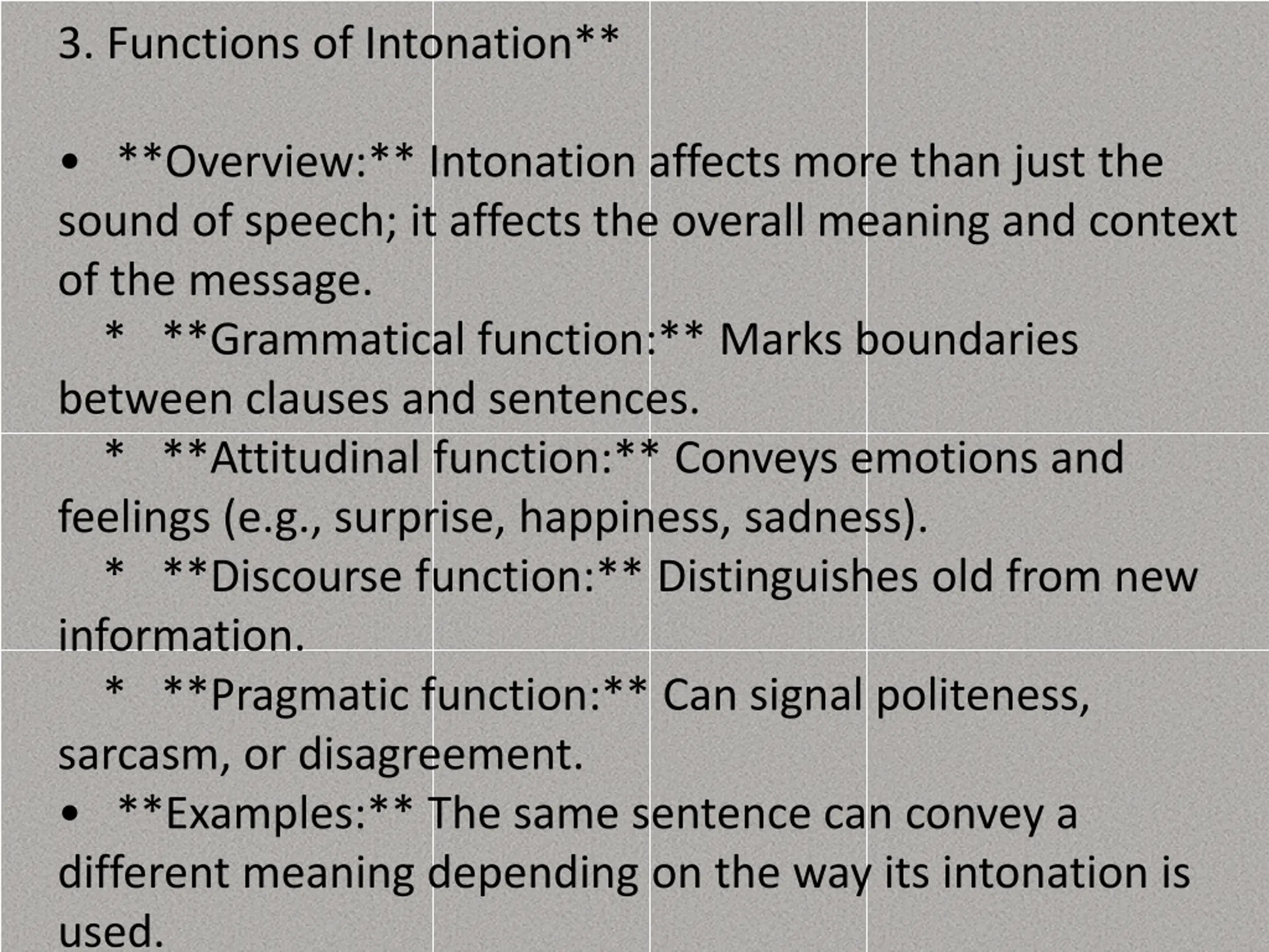 3. Functions of Intonation** **Overview:** Intonation affects more than just the sound of speech; it affects the overall meaning and context of the message. * **Grammatical function:** Marks boundaries between clauses and sentences. * **Attitudinal function:** Conveys emotions and feelings (e.g., surprise, happiness, sadness). * **Discourse function:** Distinguishes old from new information. * **Pragmatic function:** Can signal politeness, sarcasm, or disagreement. **Examples:** The same sentence can convey a different meaning depending on the way its intonation is used.