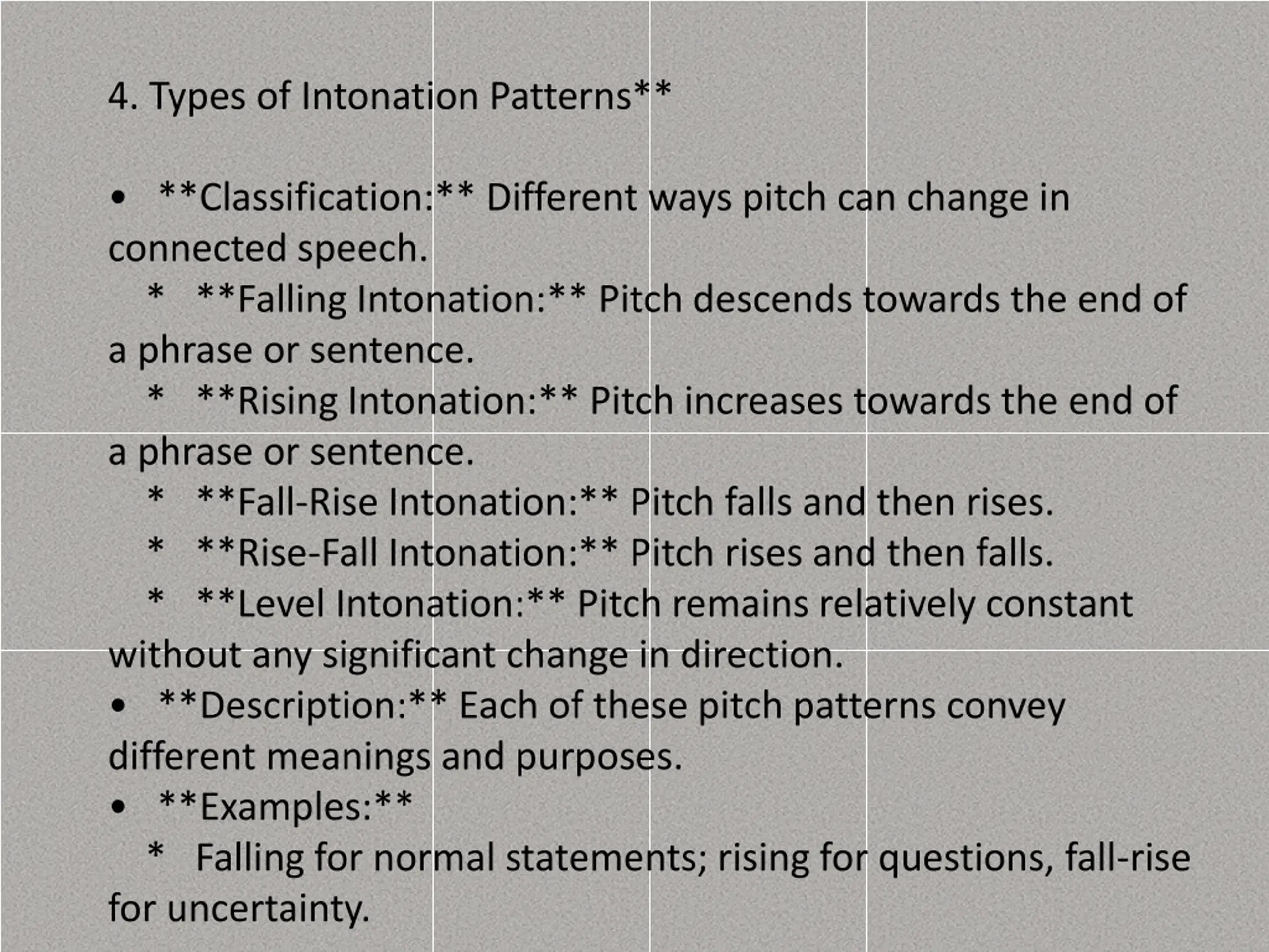 4. Types of Intonation Patterns** **Classification:** Different ways pitch can change in connected speech. * **Falling Intonation:** Pitch descends towards the end of a phrase or sentence. * **Rising Intonation:** Pitch increases towards the end of a phrase or sentence. * **Fall-Rise Intonation:** Pitch falls and then rises. * **Rise-Fall Intonation:** Pitch rises and then falls. * **Level Intonation:** Pitch remains relatively constant without any significant change in direction. **Description:** Each of these pitch patterns convey different meanings and purposes. **Examples:** * Falling for normal statements; rising for questions, fall-rise for uncertainty.