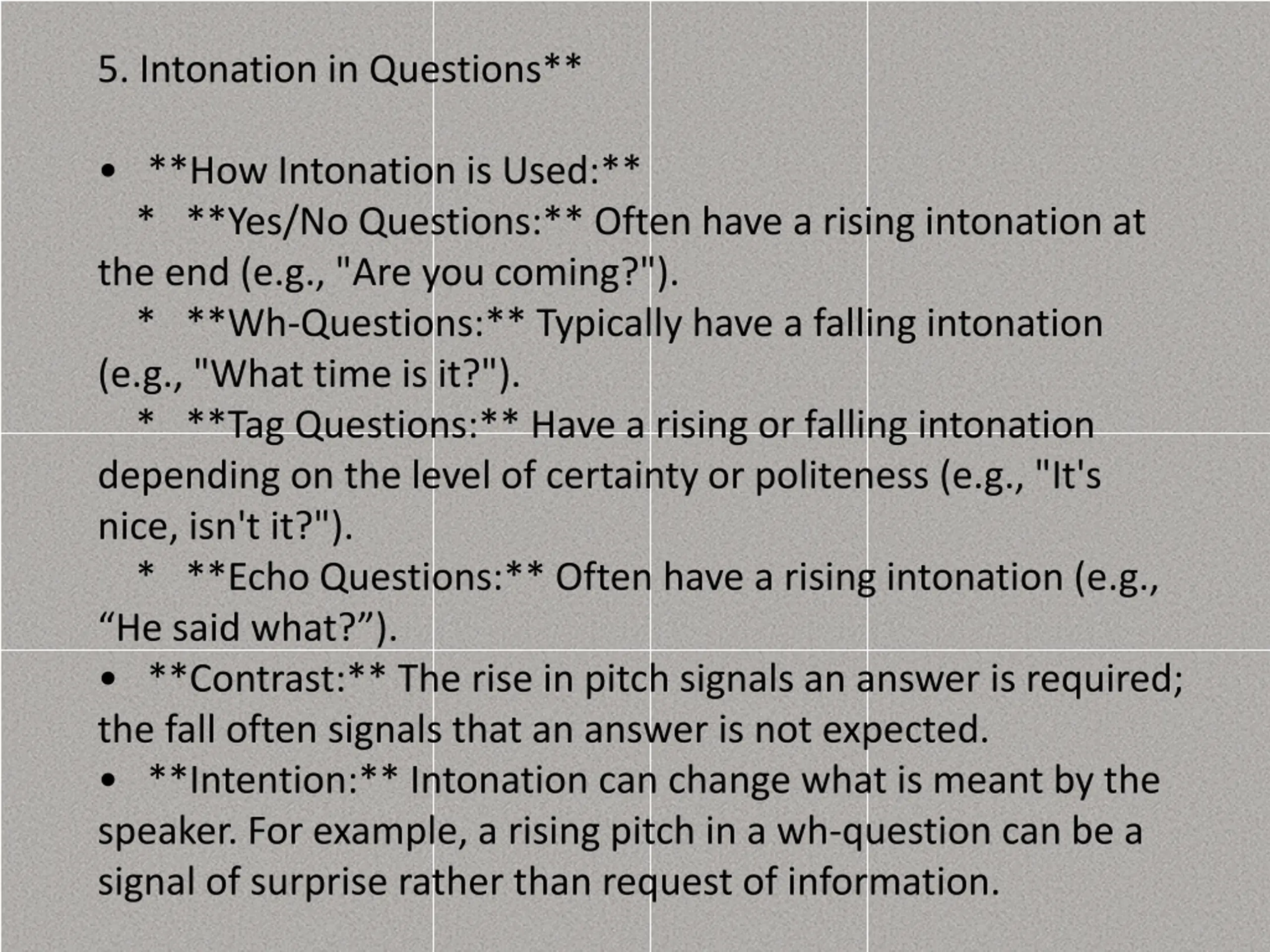 5. Intonation in Questions** **How Intonation is Used:** * **Yes/No Questions:** Often have a rising intonation at the end (e.g., "Are you coming?"). * **Wh-Questions:** Typically have a falling intonation (e.g., "What time is it?"). * **Tag Questions:** Have a rising or falling intonation depending on the level of certainty or politeness (e.g., "It's nice, isn't it?"). * **Echo Questions:** Often have a rising intonation (e.g., He said what? ). **Contrast:** The rise in pitch signals an answer is required; the fall often signals that an answer is not expected. **Intention:** Intonation can change what is meant by the speaker. For example, a rising pitch in a wh-question can be a signal of surprise rather than request of information.