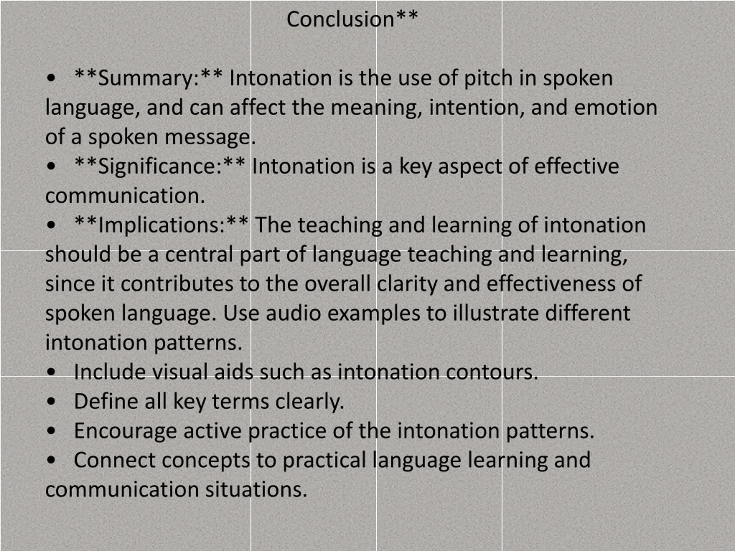 Conclusion** **Summary:** Intonation is the use of pitch in spoken language, and can affect the meaning, intention, and emotion of a spoken message. **Significance:** Intonation is a key aspect of effective communication. **Implications:** The teaching and learning of intonation should be a central part of language teaching and learning, since it contributes to the overall clarity and effectiveness of spoken language. Use audio examples to illustrate different intonation patterns. Include visual aids such as intonation contours. Define all key terms clearly. Encourage active practice of the intonation patterns. Connect concepts to practical language learning and communication situations.