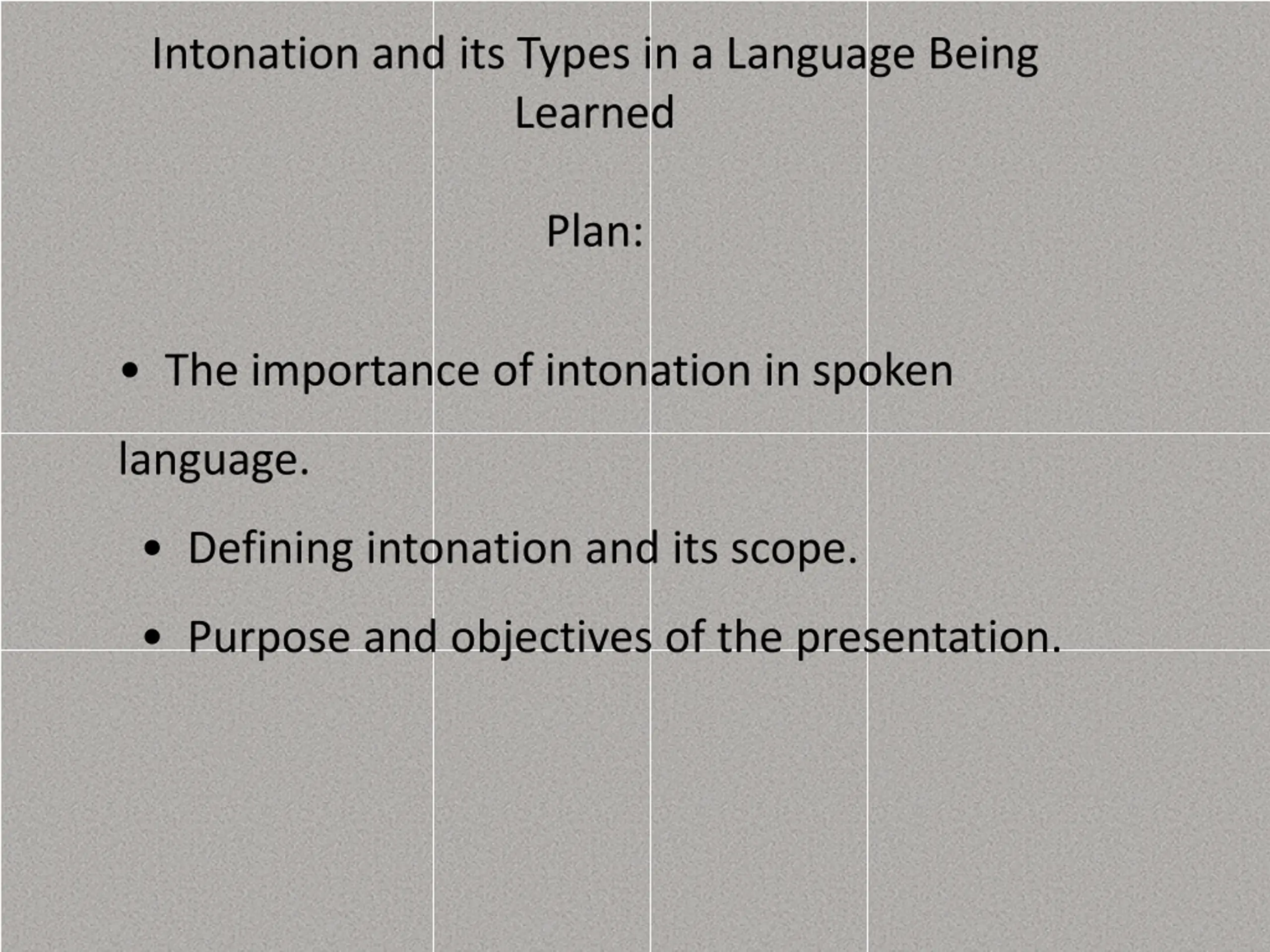 Intonation and its Types in a Language Being Learned Plan: The importance of intonation in spoken language. Defining intonation and its scope. Purpose and objectives of the presentation.