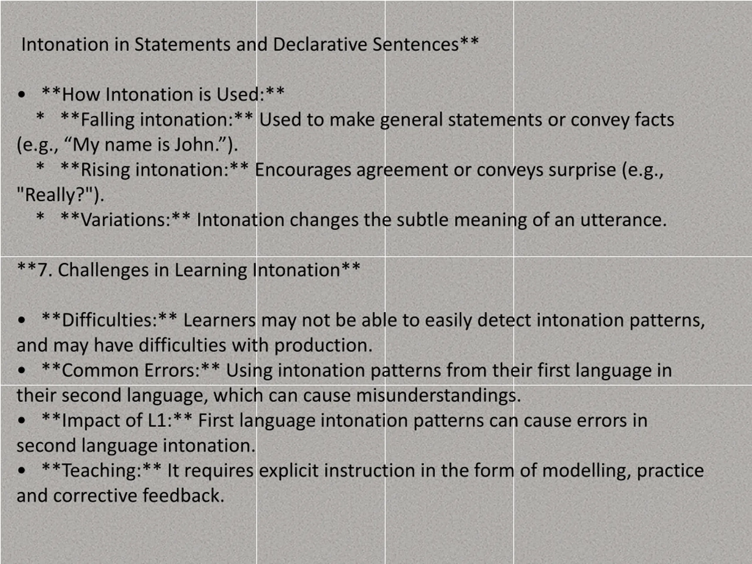 Intonation in Statements and Declarative Sentences** **How Intonation is Used:** * **Falling intonation:** Used to make general statements or convey facts (e.g., My name is John. ). * **Rising intonation:** Encourages agreement or conveys surprise (e.g., "Really?"). * **Variations:** Intonation changes the subtle meaning of an utterance. **7. Challenges in Learning Intonation** **Difficulties:** Learners may not be able to easily detect intonation patterns, and may have difficulties with production. **Common Errors:** Using intonation patterns from their first language in their second language, which can cause misunderstandings. **Impact of L1:** First language intonation patterns can cause errors in second language intonation. **Teaching:** It requires explicit instruction in the form of modelling, practice and corrective feedback.