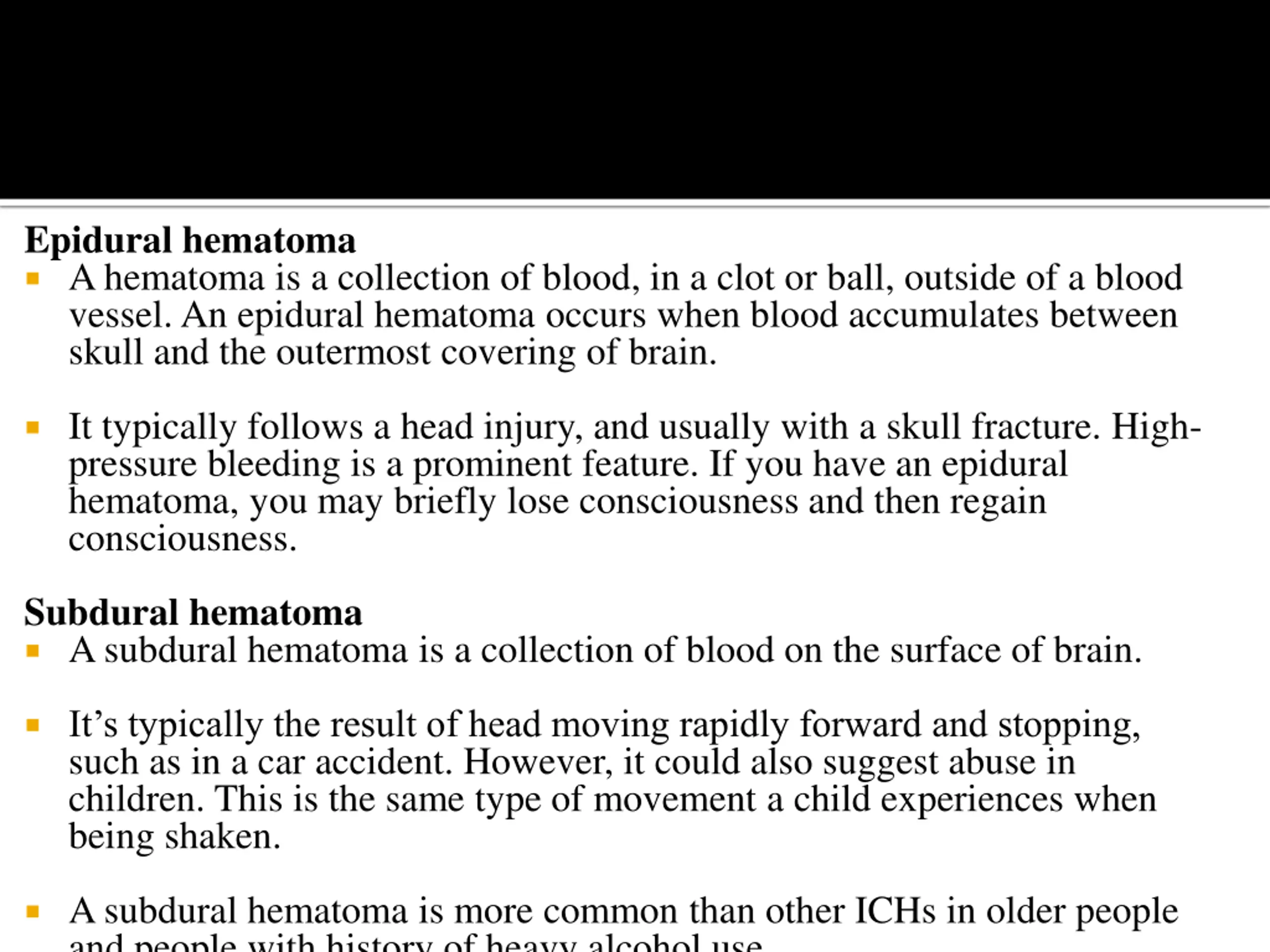 Epidural hematoma A hematoma is a collection of blood, in a clot or ball, outside of a blood vessel. An epidural hematoma occurs when blood accumulates between skull and the outermost covering of brain. It typically follows a head injury, and usually with a skull fracture. High- pressure bleeding is a prominent feature. If you have an epidural hematoma, you may briefly lose consciousness and then regain consciousness. Subdural hematoma Asubdural hematoma is a collection of blood on the surface of brain. It s typically the result of head moving rapidly forward and stopping, such as in a car accident. However, it could also suggest abuse in children. This is the same type of movement a child experiences when being shaken. A subdural hematoma is more common than other ICHs in older people and people with history of heavy alcohol use.