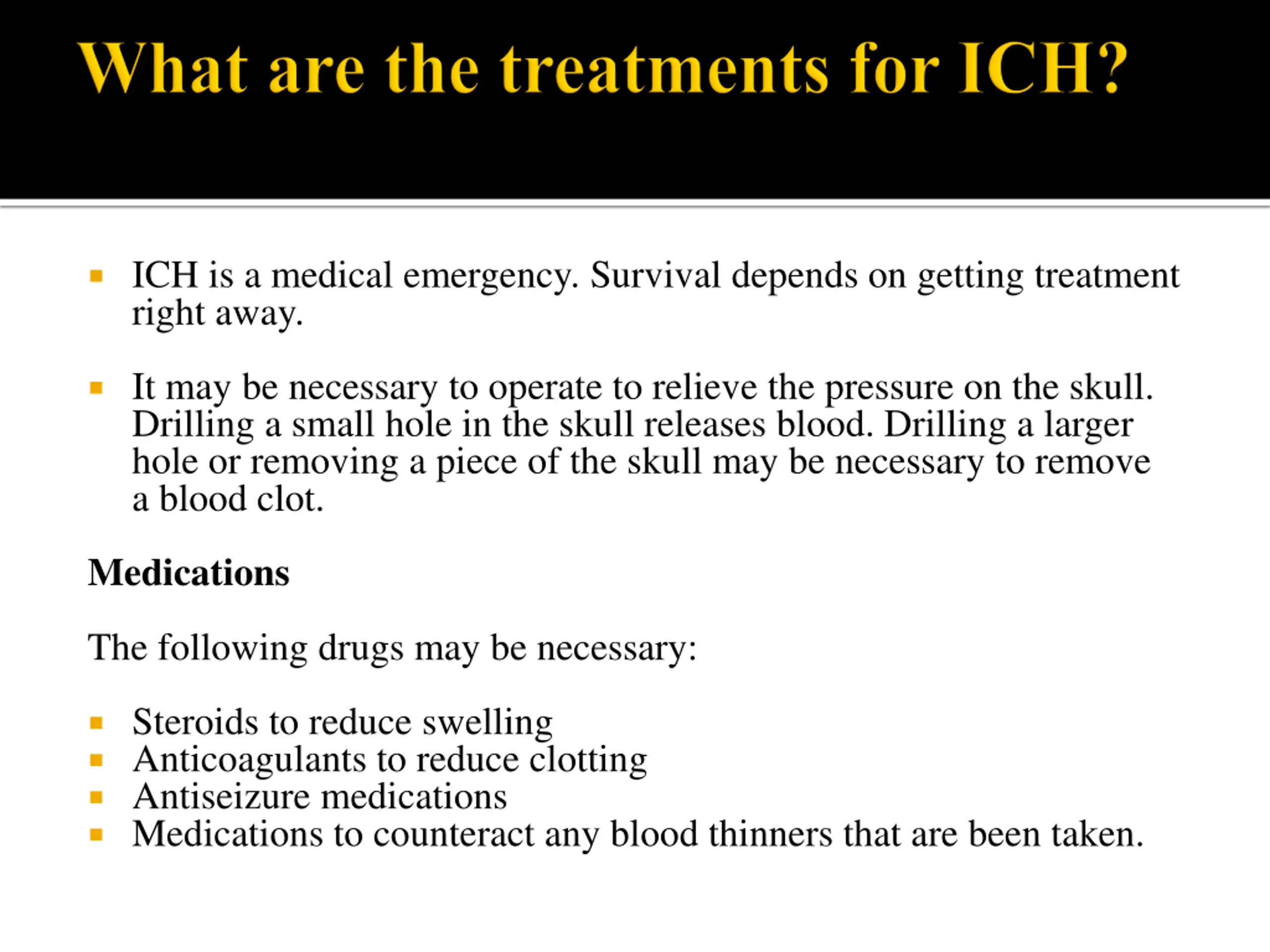 ICH is a medical emergency. Survival depends on getting treatment right away. It may be necessary to operate to relieve the pressure on the skull. Drilling a small hole in the skull releases blood. Drilling a larger hole or removing a piece of the skull may be necessary to remove a blood clot. Medications The following drugs may be necessary: Steroids to reduce swelling Anticoagulants to reduce clotting Antiseizure medications Medications to counteract any blood thinners that are been taken.