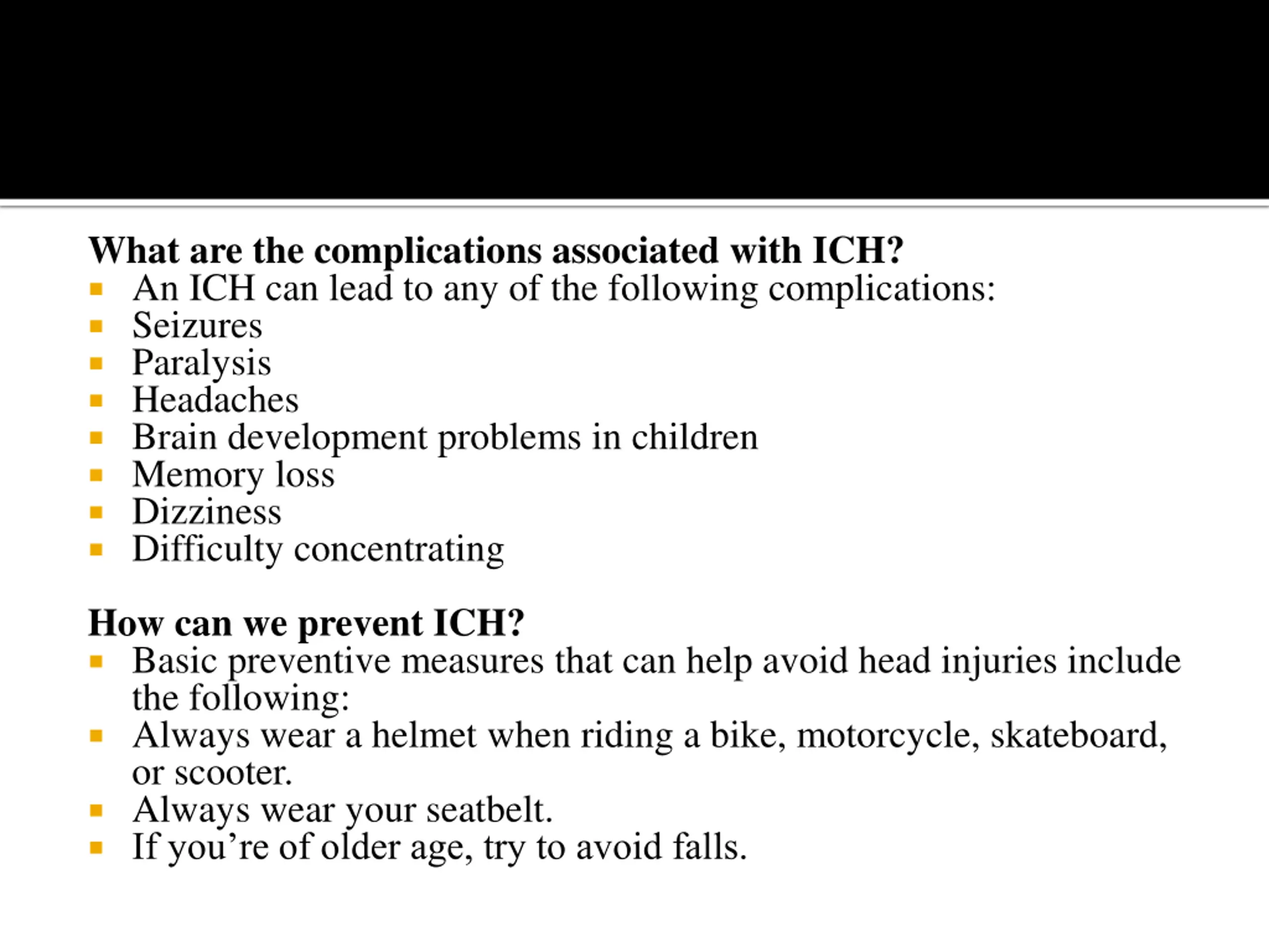 What are the complications associated with ICH? An ICH can lead to any of the following complications: Seizures Paralysis Headaches Brain development problems in children Memory loss Dizziness Difficulty concentrating How can we prevent ICH? Basic preventive measures that can help avoid head injuries include the following: Always wear a helmet when riding a bike, motorcycle, skateboard, or scooter. Always wear your seatbelt. If you re of older age, try to avoid falls.