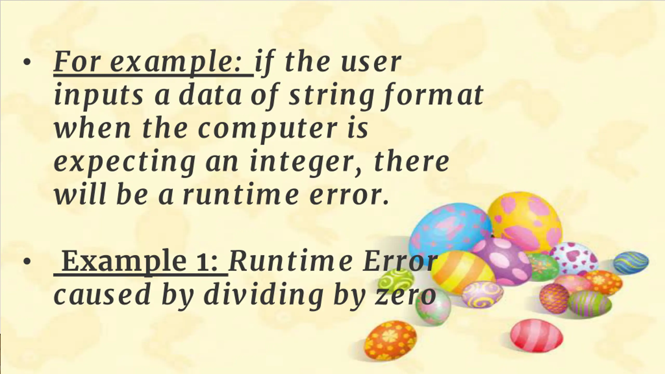 For example: if the user inputs a data of string format when the computer is expecting an integer, there will be a runtime error. Example 1: Runtime Error caused by dividing by zero