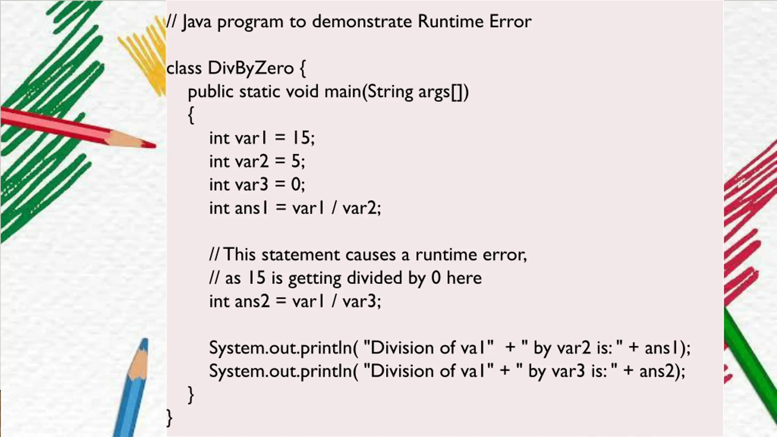 // Java program to demonstrate Runtime Error class DivByZero { public static void main(String args[]) { int var1 = 15; int var2 = 5; int var3 = 0; int ans1 = var1 / var2; // This statement causes a runtime error, // as 15 is getting divided by 0 here int ans2 = var1 / var3; System.out.println( "Division of va1" + " by var2 is: " + ans1); System.out.println( "Division of va1" + " by var3 is: " + ans2); } }