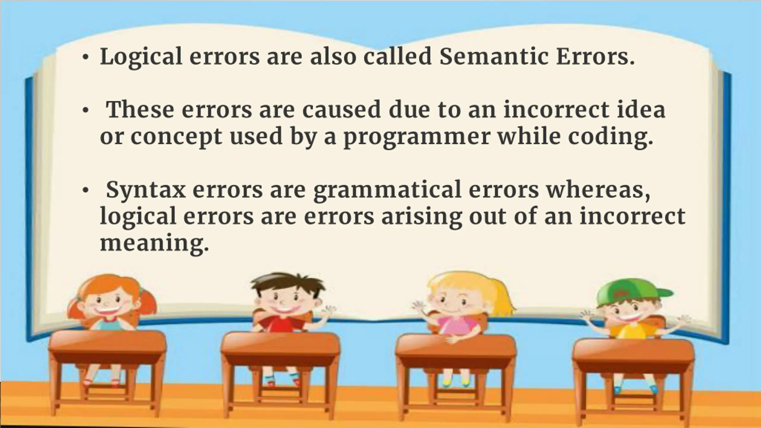 Logical errors are also called Semantic Errors. These errors are caused due to an incorrect idea or concept used by a programmer while coding. Syntax errors are grammatical errors whereas, logical errors are errors arising out of an incorrect meaning.