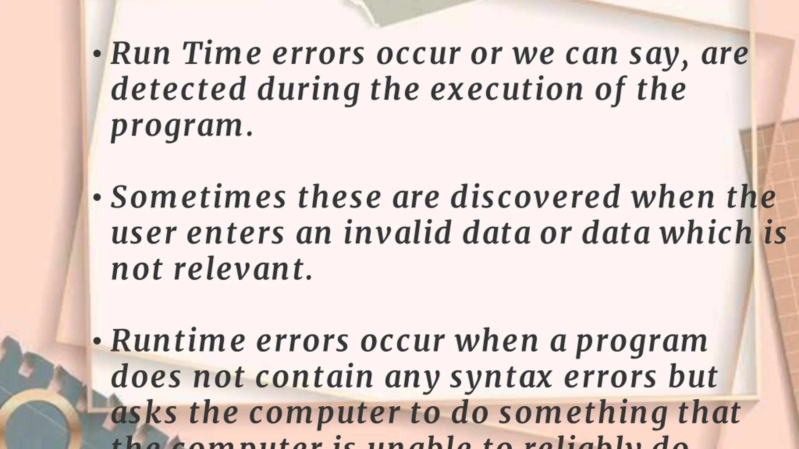 Run Time errors occur or we can say, are detected during the execution of the program. Sometimes these are discovered when the user enters an invalid data or data which is not relevant. Runtime errors occur when a program does not contain any syntax errors but asks the computer to do something that the computer is unable to reliably do.