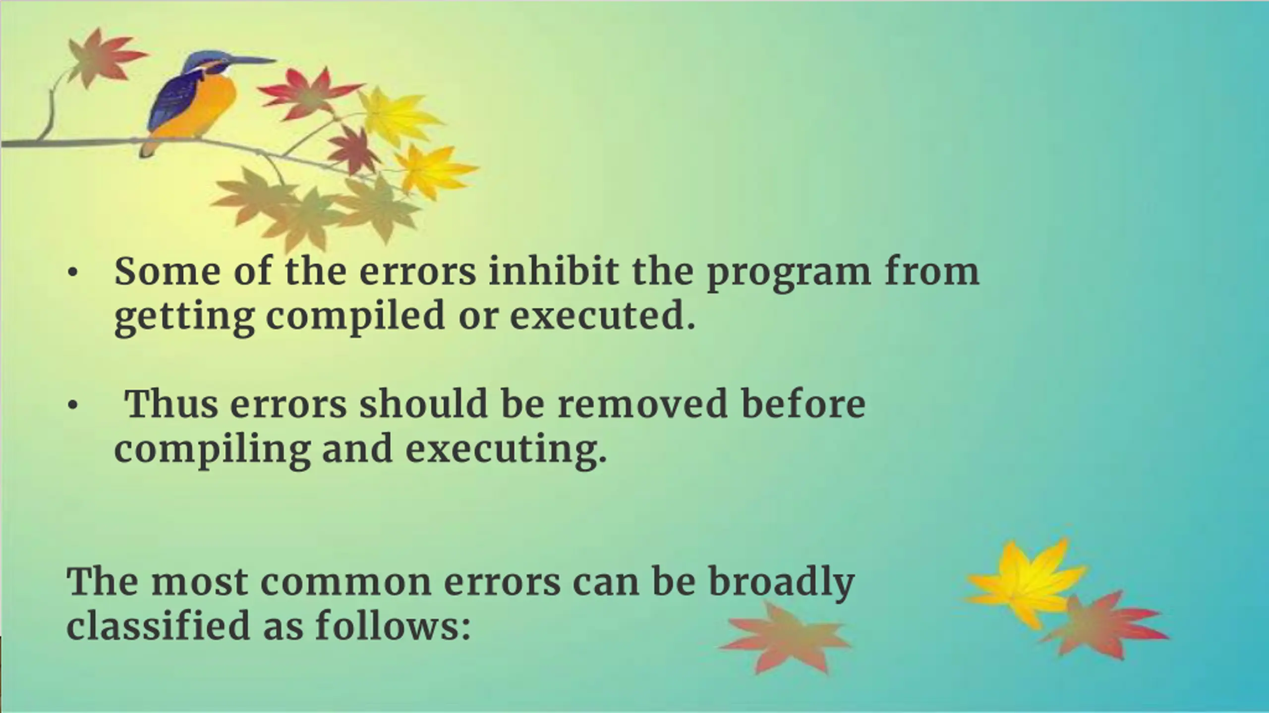 Some of the errors inhibit the program from getting compiled or executed. Thus errors should be removed before compiling and executing. The most common errors can be broadly classified as follows: