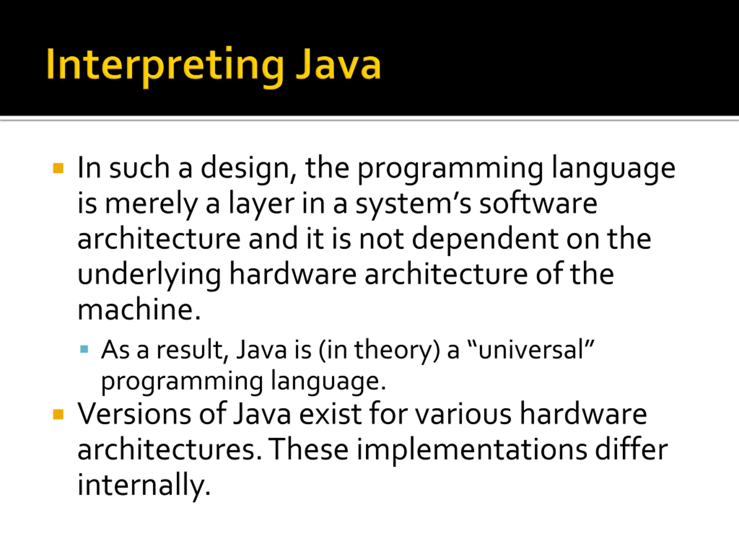 In such a design, the programming language is merely a layer in a system s software architecture and it is not dependent on the underlying hardware architecture of the machine. As a result, Java is (in theory) a universal programming language. Versions of Java exist for various hardware architectures. These implementations differ internally.
