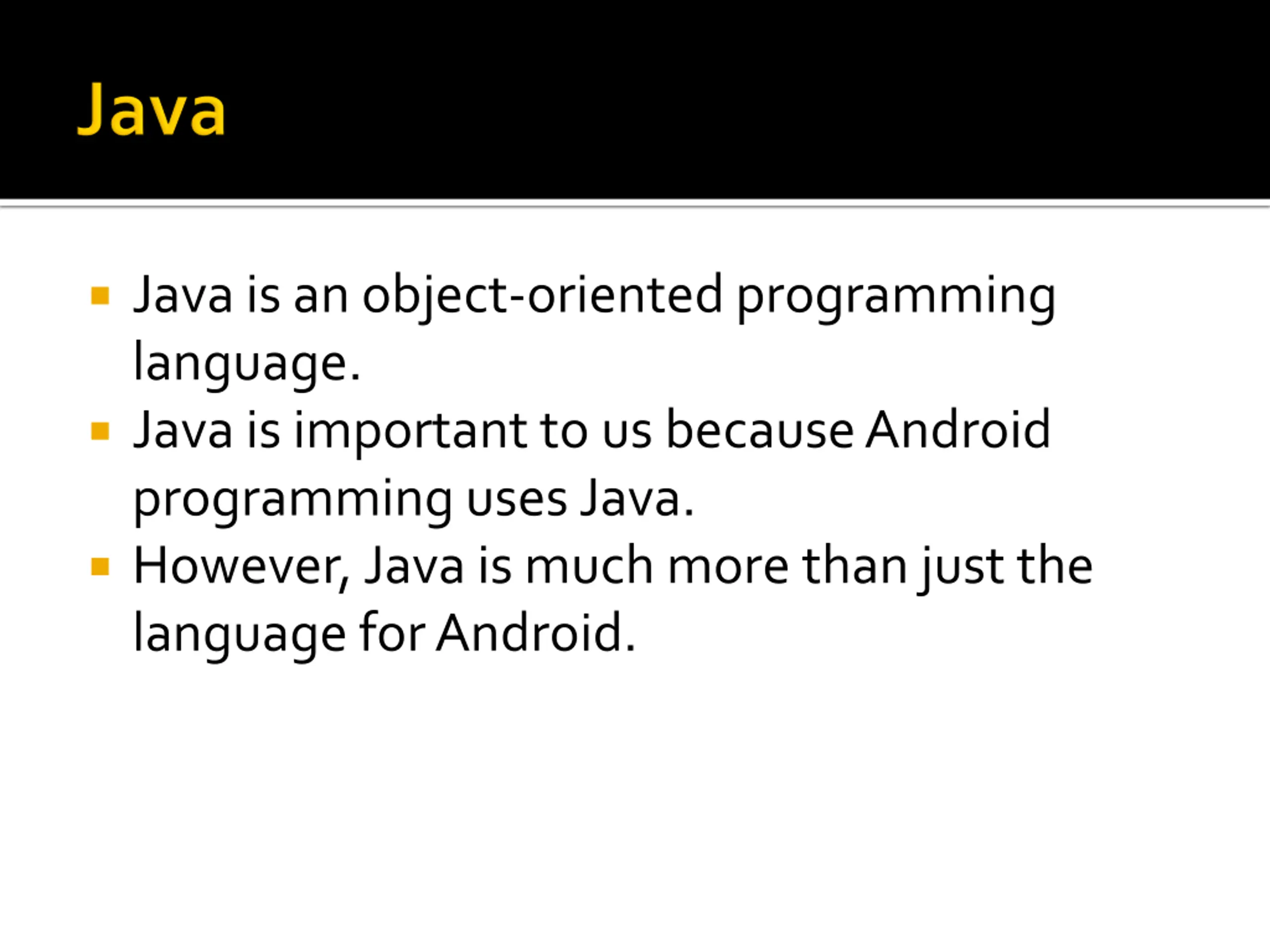 Java is an object-oriented programming language. Java is important to us because Android programming uses Java. However, Java is much more than just the language for Android.