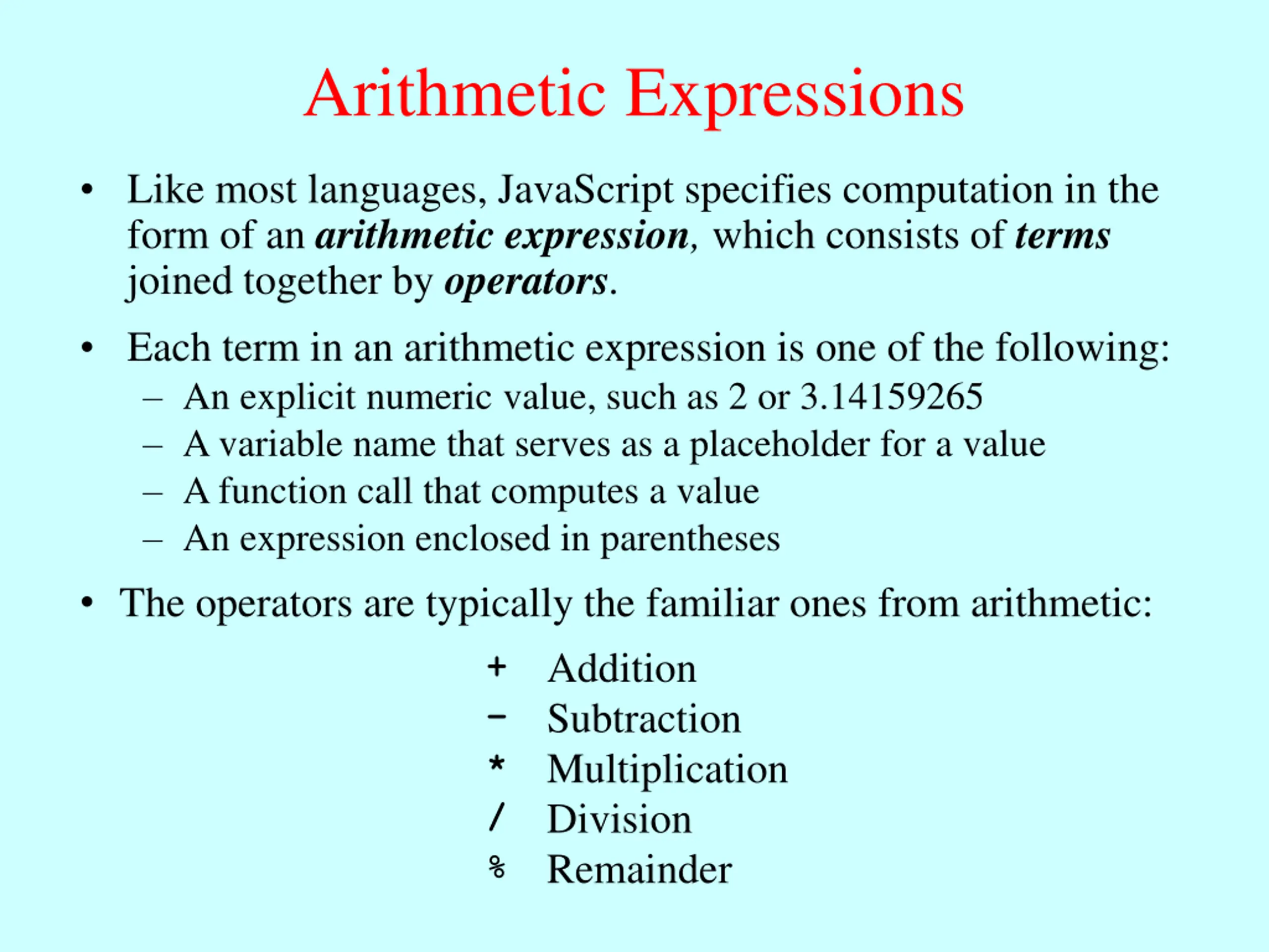 Arithmetic Expressions Like most languages, JavaScript specifies computation in the form of an arithmetic expression, which consists of terms joined together by operators. Each term in an arithmetic expression is one of the following: An explicit numeric value, such as 2 or 3.14159265 A variable name that serves as a placeholder for a value A function call that computes a value An expression enclosed in parentheses The operators are typically the familiar ones from arithmetic: Addition Subtraction * Multiplication / Division % Remainder +